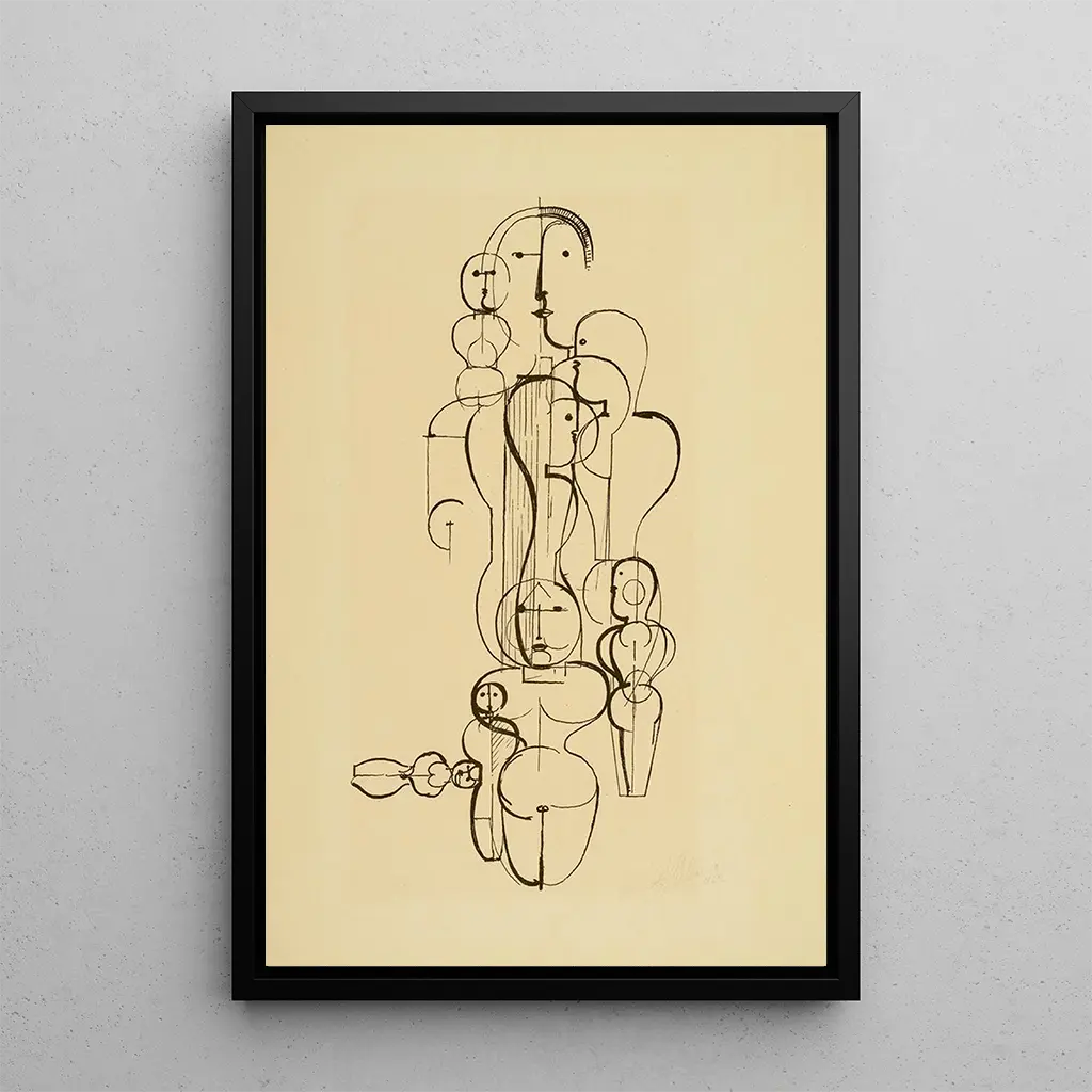 Oskar Schlemmer, figura emblemática del movimiento Bauhaus, dejó su huella en la historia del arte por su enfoque innovador de la forma y el color. Nacido en 1888 en Alemania, fue influenciado por las corrientes vanguardistas de su época, especialmente el cubismo y el futurismo. Schlemmer supo combinar su amor por la danza y el teatro con su pasión por la pintura, creando obras que cuestionan la percepción y la interacción humana. "Plan de grupo concéntrico K1" se inscribe en un período donde el arte buscaba liberarse de las convenciones, y Schlemmer, con su estilo único, contribuyó a redefinir las fronteras del arte visual.