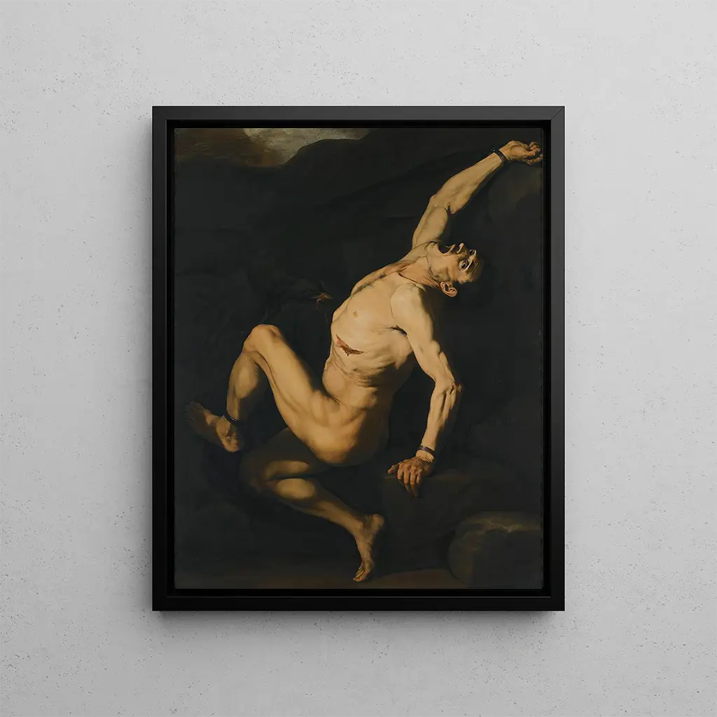 Reproducción artística de Prometeo del pintor Jusepe de Ribera. Esta obra maestra captura la intensidad y la dramatización de la leyenda clásica, perfecta para decorar su hogar u oficina con un toque de historia y arte.