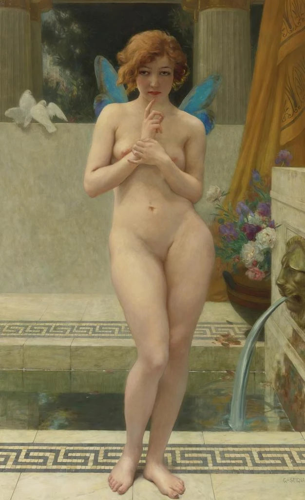 Guillaume Seignac, figura destacada del neoclasicismo, supo imponerse gracias a su talento para representar la belleza femenina. Activo a principios del siglo XX, fue influenciado por los grandes maestros de la historia del arte, desarrollando un estilo personal que combina sensualidad y elegancia. Sus obras, a menudo inspiradas en la mitología y la poesía, testimonian una época en la que el arte era una celebración de la belleza. Psyché en la fuente es una de sus creaciones más emblemáticas, ilustrando su habilidad para capturar emociones profundas a través de representaciones femeninas.