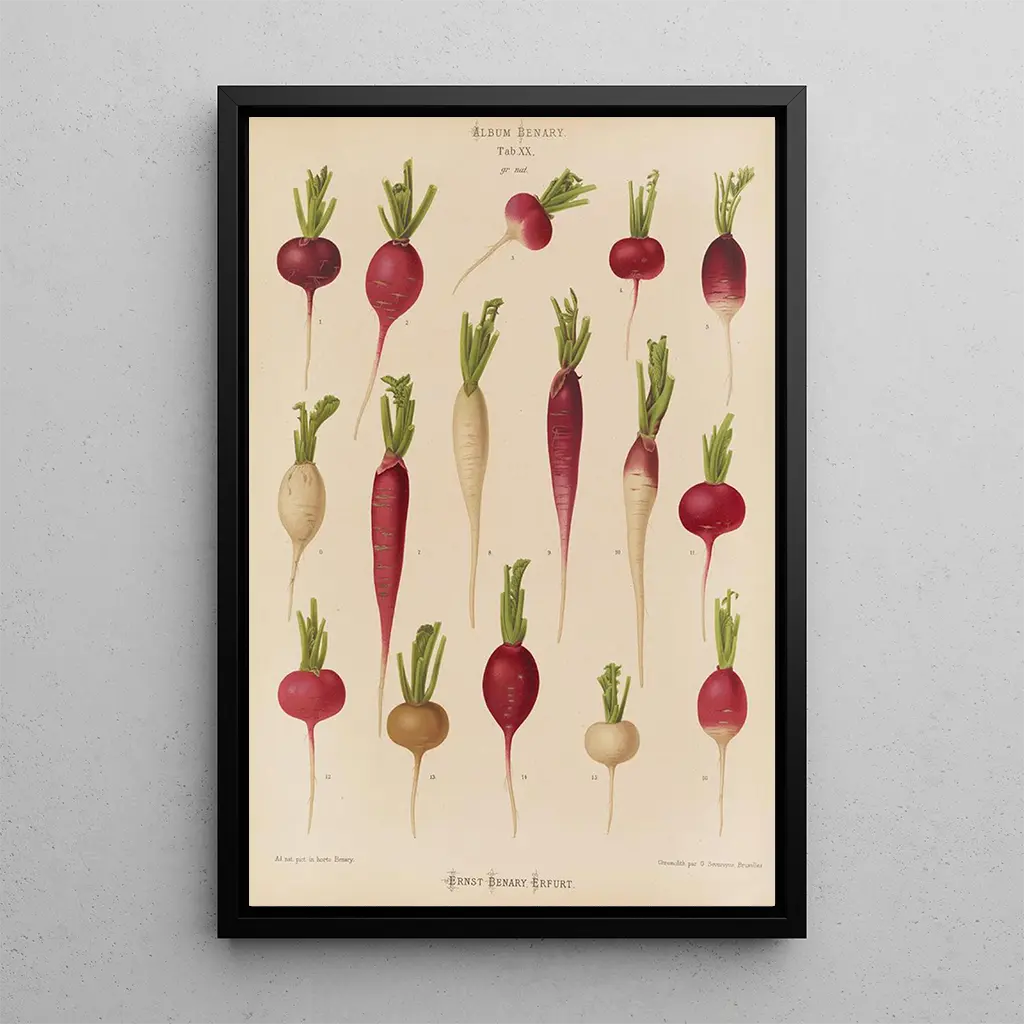 "Radis" de Ernst Benary es una obra que celebra la belleza de los productos de la tierra con una sencillez sorprendente. La tela presenta una composición armoniosa donde los radis, con colores vivos y brillantes, están dispuestos de manera que atraen la mirada. Las tonalidades de rojo, verde y blanco crean un contraste impactante, mientras que la luz juega sobre las superficies lisas de las verduras, dándoles vida. Esta naturaleza muerta evoca no solo la frescura de las cosechas, sino también una cierta alegría de vivir, invitando al espectador a apreciar los placeres simples de la naturaleza.