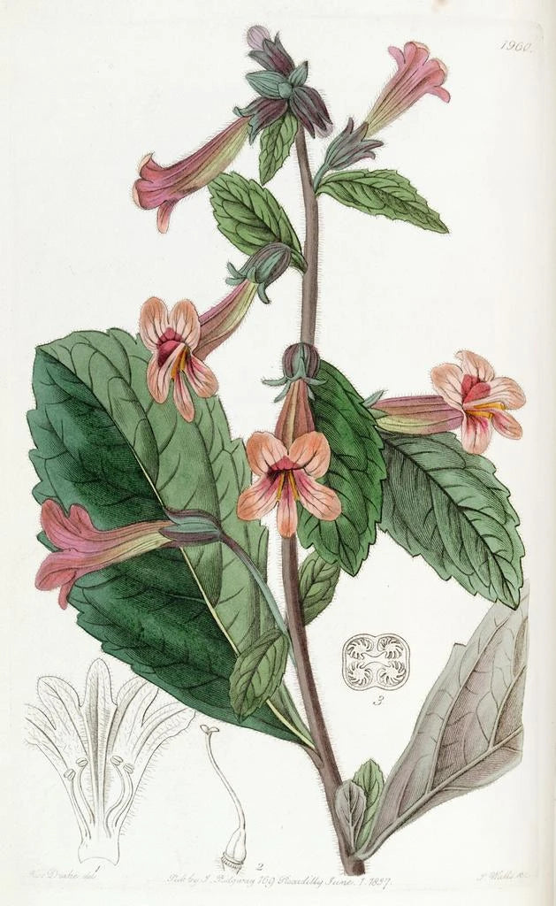 La impresión artística de la Rehmannia china nos transporta a un mundo donde la botánica y el arte se encuentran con elegancia. Los tonos cálidos de rosa y verde se entrelazan para crear una composición armoniosa, revelando la belleza delicada de esta planta medicinal. La técnica de Sydenham Edwards, a la vez minuciosa y expresiva, captura la esencia misma de la Rehmannia, evocando una atmósfera de tranquilidad y bienestar. Cada detalle está cuidadosamente representado, invitando al espectador a apreciar la esplendor de la naturaleza.