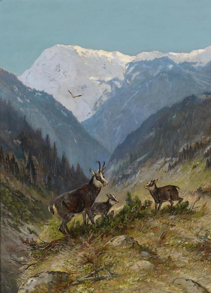 Moritz Müller, pintor animalista del siglo XIX, es reconocido por su capacidad para inmortalizar la fauna en su hábitat natural. Su obra se inscribe en un contexto artístico donde la observación de la naturaleza se vuelve primordial, influenciado por el romanticismo y el realismo. Müller supo combinar su pasión por la pintura con su amor por los animales, lo que le permitió crear obras que trascienden el simple retrato animalista. La impresión artística del rebaño de chamois es un ejemplo perfecto de su talento, ilustrando no solo la belleza de los animales, sino también su lugar en el ecosistema montañés.