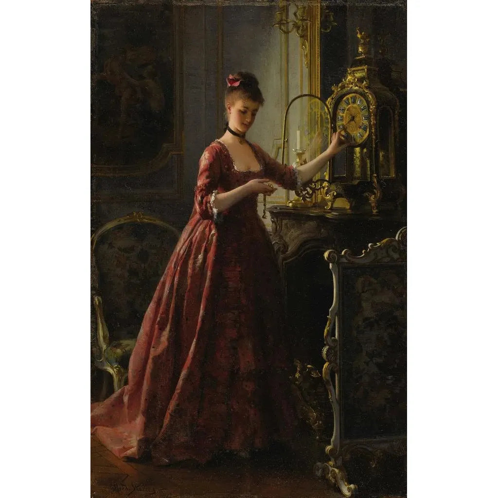 Remontar el reloj de chimenea de Alfred Stevens captura un momento íntimo y nostálgico, donde el tiempo parece suspendido. La escena, rica en detalles, destaca a una mujer absorta en la tarea de remontar un reloj, símbolo del paso del tiempo. Los colores cálidos y los juegos de luz crean una atmósfera acogedora y cálida, mientras que la técnica de Stevens, combinando realismo y finura, da vida a cada elemento de la composición. Este cuadro evoca una melancolía suave, recordando la importancia de los recuerdos y los instantes compartidos.