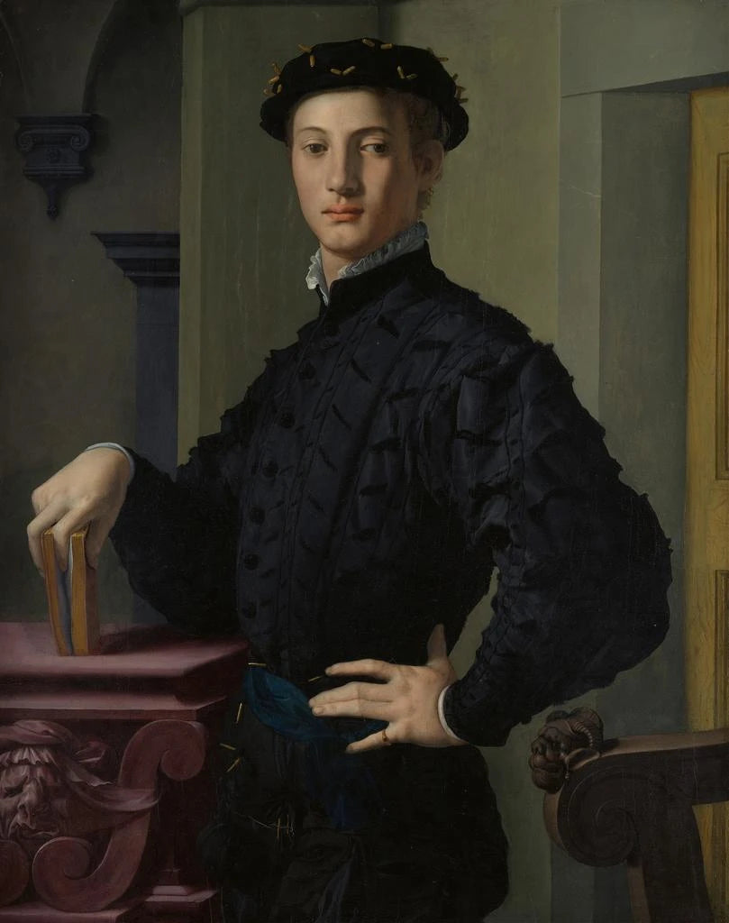 El estilo de Bronzino se distingue por su precisión y sofisticación. En el "Retrato de un joven", cada elemento está cuidadosamente orquestado para crear una armonía visual impactante. El rostro del joven está representado con un realismo sorprendente, sus rasgos delicados y sus ojos penetrantes parecen escrutar al espectador con una intensidad inquietante. La técnica de sfumato, utilizada por el artista, confiere una suavidad a los contornos, mientras que los colores vibrantes y los juegos de luz acentúan la tridimensionalidad del rostro. La postura del joven, ligeramente inclinada, así como su vestimenta ricamente decorada, reflejan un estatus social elevado, al mismo tiempo que sugieren una cierta introspección, una dualidad entre fuerza y vulnerabilidad. Esta obra ilustra perfectamente los ideales de belleza del Renacimiento, integrando además elementos de misterio y profundidad psicológica.