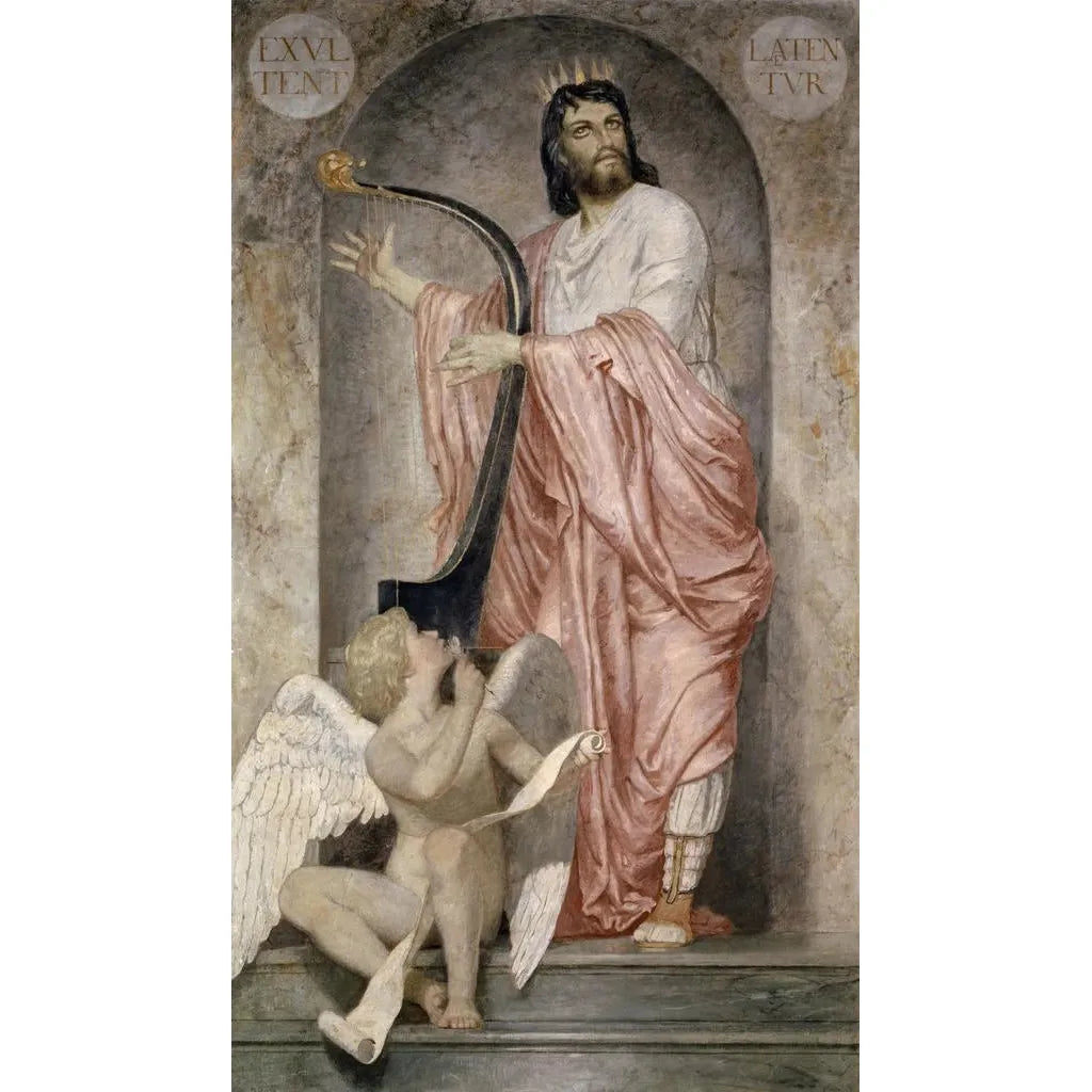 En esta obra cautivadora, Arnold Böcklin representa al Rey David con una intensidad que trasciende el tiempo. Los colores ricos y profundos, combinando tonos de rojo y oro, crean una atmósfera a la vez solemne y vibrante. La técnica de Böcklin, que combina realismo y simbolismo, permite sentir la potencia y la sabiduría del rey. El fondo, con sus paisajes místicos, refuerza la idea de un personaje a la vez humano y divino, invitando al espectador a contemplar la grandeza de su historia.