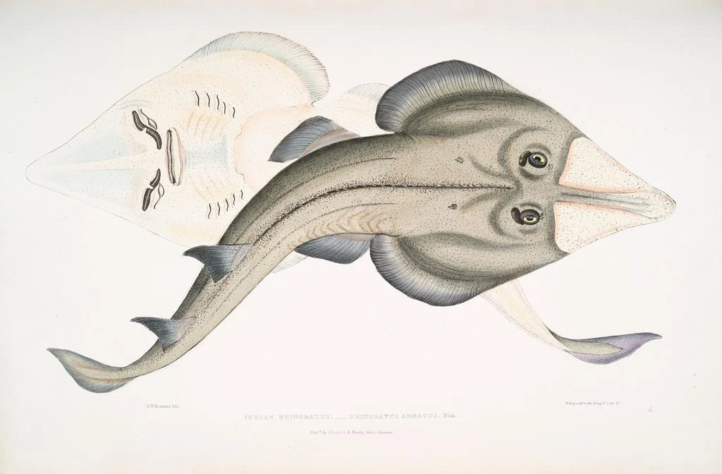 El cuadro Rhinobate armé indien, realizado por John Edward Gray, es una fascinante representación de este pez único. Los tonos terrosos y las matices de verde se mezclan para crear un retrato impactante de este animal acuático. La precisión de los detalles, desde las escamas hasta las aletas, demuestra una observación minuciosa de la naturaleza. La atmósfera de la obra evoca tanto la majestuosidad como la fragilidad de la fauna, invitándonos a reflexionar sobre la biodiversidad. Cada elemento de la composición parece vibrar con una vida propia, haciendo que esta impresión artística sea cautivadora y llena de carácter.