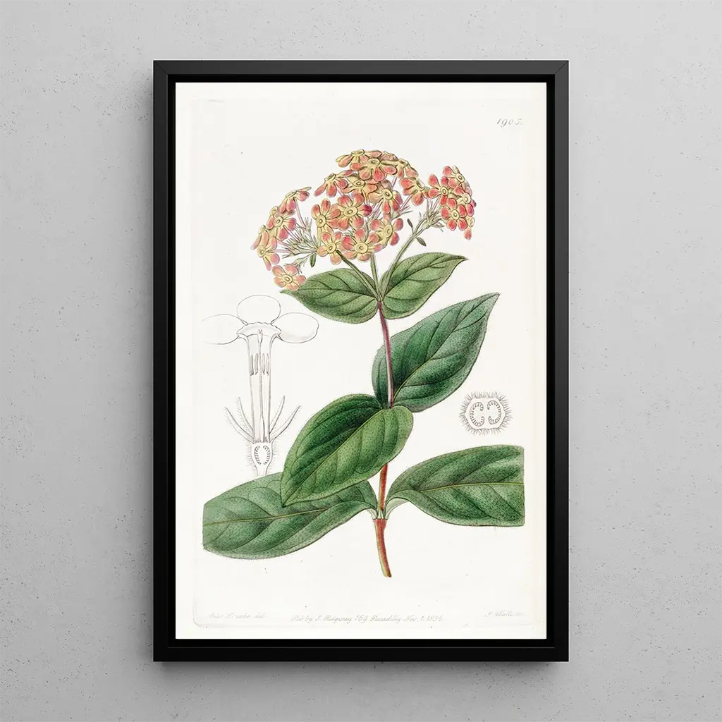 La impresión artística de la Rondeletia douce nos transporta a un jardín exuberante, donde los colores vibrantes se entrelazan con gracia. Las flores, de un rojo brillante, se destacan sobre un fondo verde, creando un contraste impactante que atrae inmediatamente la mirada. La delicada técnica de acuarela, dominada por Sydenham Edwards, permite reproducir la textura de los pétalos y la luminosidad de las hojas con gran finura. Esta obra evoca una atmósfera alegre y viva, invitando a la evasión y a la contemplación de la belleza natural.
