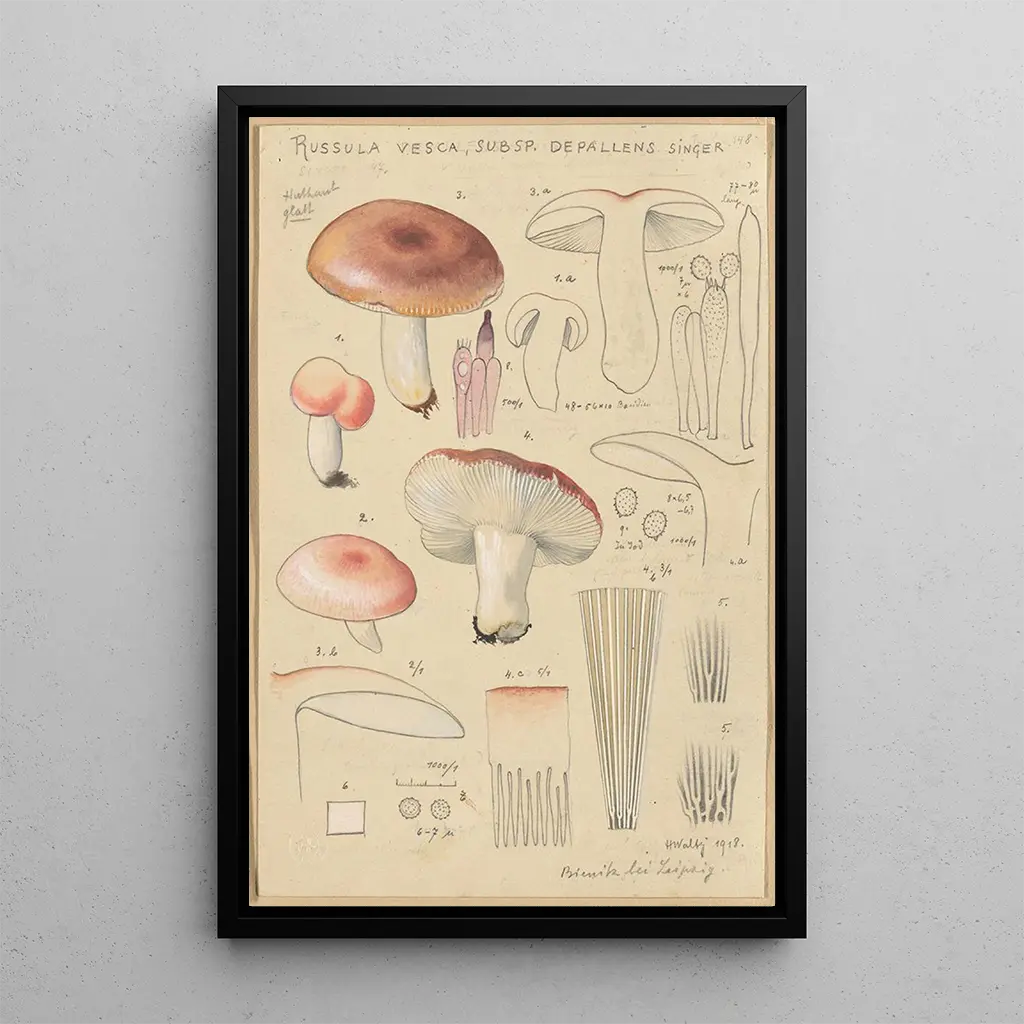 La impresión artística de Russula vesca subsp Depallens singer es una opción decorativa ideal para quienes desean aportar un toque de originalidad a su interior. Ya sea en una sala, una oficina o un dormitorio, esta obra atrae la mirada y despierta interés. La calidad de impresión garantiza una fidelidad notable a los detalles y colores de la obra original, asegurando un atractivo estético duradero. Al integrar esta obra en tu decoración, brindas a tu espacio un ambiente cálido y acogedor, celebrando la belleza de la naturaleza y la riqueza de su ecosistema.