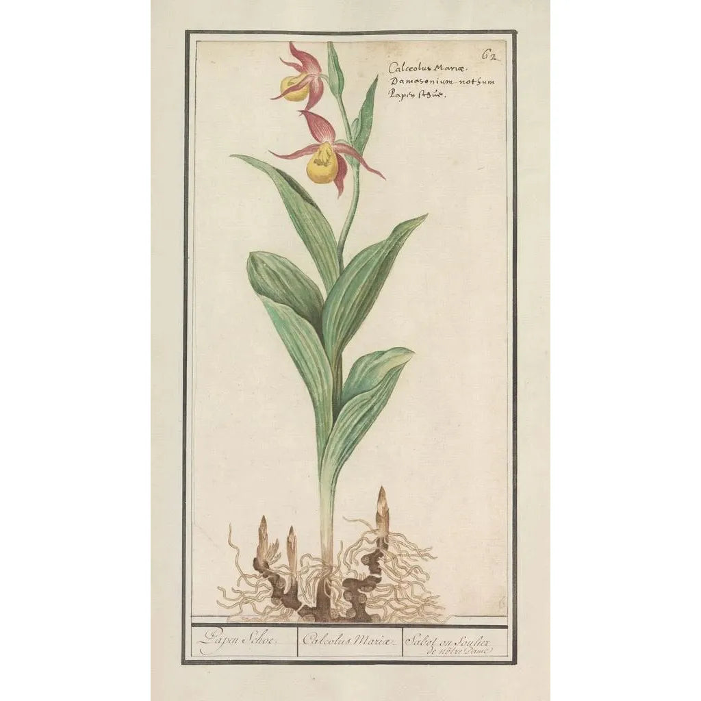 Anselmus Botius de Boodt, botánico y artista del siglo XVII, desempeñó un papel crucial en la representación de especies vegetales. Su obra se inscribe en un contexto donde la ciencia y el arte se unen, permitiendo una mejor comprensión de la naturaleza. Influenciado por los descubrimientos botánicos de su época, supo capturar la belleza y la complejidad de las plantas, como el Sabot de Vénus. Esta orquídea, símbolo de rareza y delicadeza, ilustra perfectamente su enfoque meticuloso y su respeto por el mundo natural.