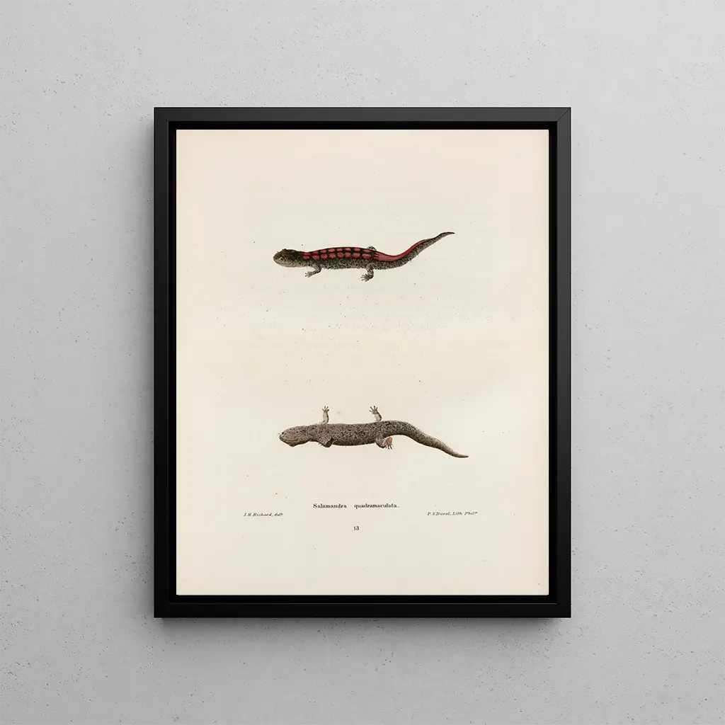 Reproducción artística de la impresionante salamandra Salamandra quadrimaculata de la colección de John Edwards Holbrook. Perfecta para decorar tu hogar u oficina con un toque de naturaleza y elegancia.