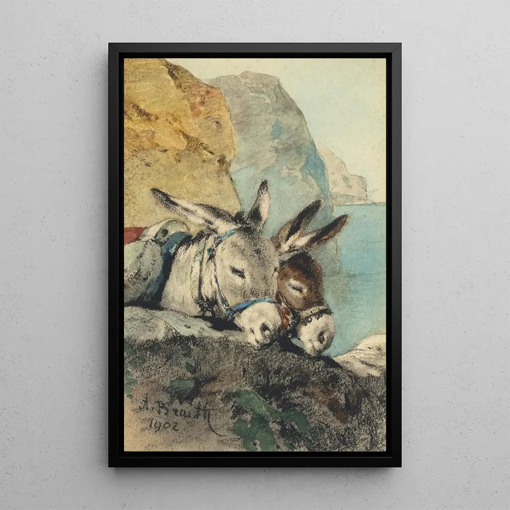 Anton Braith, artista alemán del siglo XIX, es famoso por sus representaciones de la fauna y la flora. Influenciado por el movimiento romántico, supo capturar la esencia de sus temas con una sensibilidad especial. Su carrera estuvo marcada por viajes a Italia, donde encontró inspiración en los paisajes pintorescos y la vida rural. Braith también fue un pionero en el arte animalista, destacando la belleza y la inteligencia de los animales en sus obras. La impresión artística de Couple d'ânes, saludos del lago de Garda es un ejemplo perfecto de su talento para crear composiciones armoniosas y emotivas.