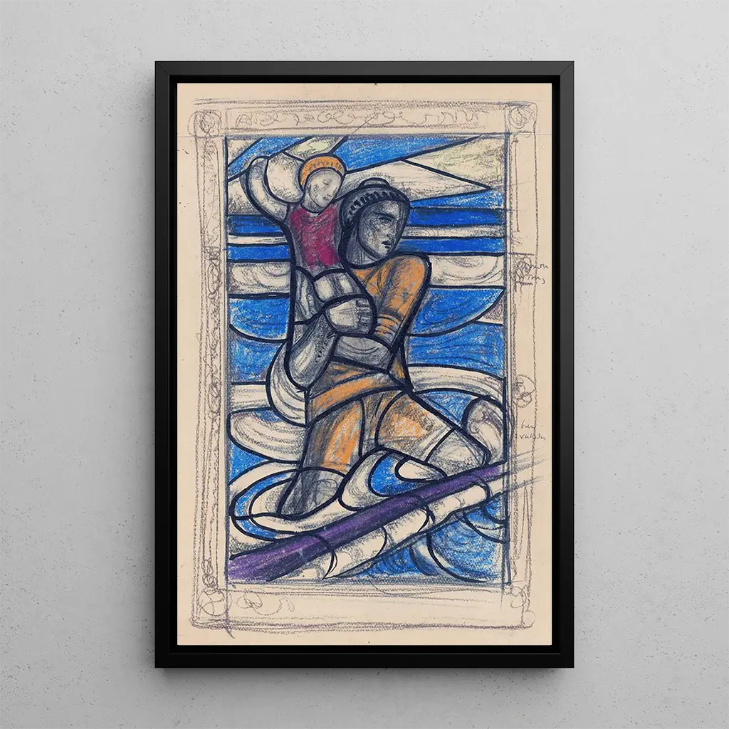 En "Saint Christophe", Richard Nicolas Roland Holst nos ofrece una representación impactante del santo patrón de los viajeros. La obra transmite una atmósfera de fuerza y devoción, donde la figura imponente de Saint Christophe se destaca por sus colores ricos y detalles minuciosos. La composición dinámica, centrada en la silueta del santo llevando al niño Jesús, evoca un sentimiento de movimiento y protección. Las tonalidades de azul y oro crean un contraste poderoso, reforzando el impacto visual de esta escena emblemática. Este cuadro invita a la reflexión sobre la fe y la seguridad, al tiempo que celebra la belleza de la espiritualidad.