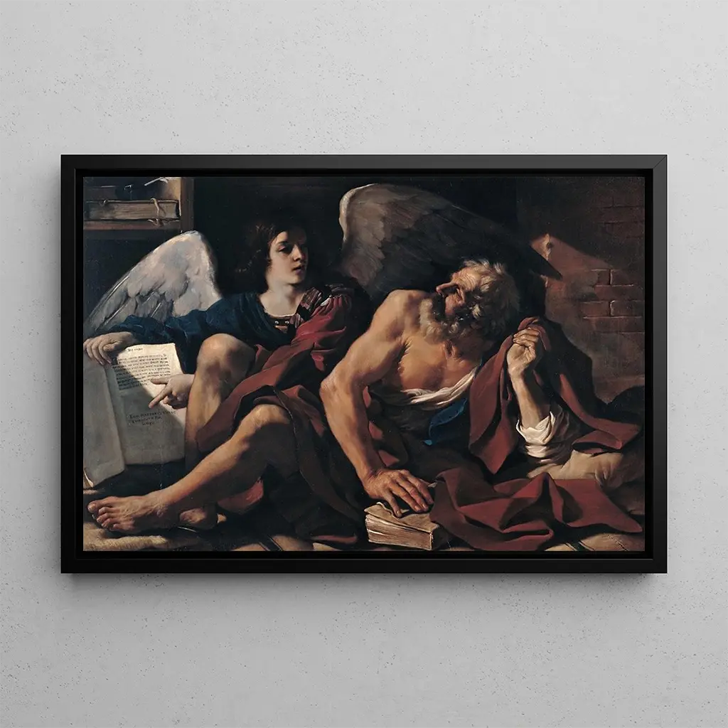 En esta obra emblemática, Guercino captura un momento de intensa espiritualidad donde San Mateo, el santo evangelista, es guiado por un ángel. La composición se caracteriza por contrastes impactantes entre sombras profundas y luces brillantes, típicos del claroscuro. Los colores cálidos, que van desde los marrones terrosos hasta los dorados luminosos, crean una atmósfera a la vez íntima y sagrada. La técnica de la impresión artística al óleo permite dar vida a las expresiones de los personajes, haciendo palpable la emoción de este encuentro místico. Cada detalle, desde el drapeado de las vestimentas hasta las plumas del ángel, refleja un cuidado minucioso que invita a la contemplación.
