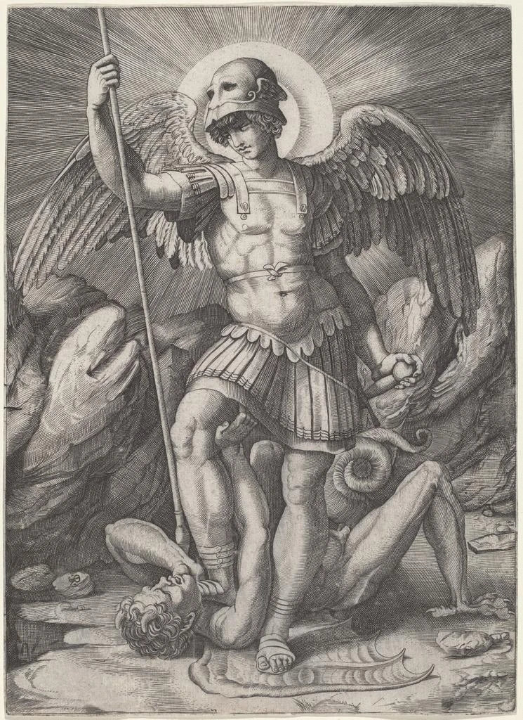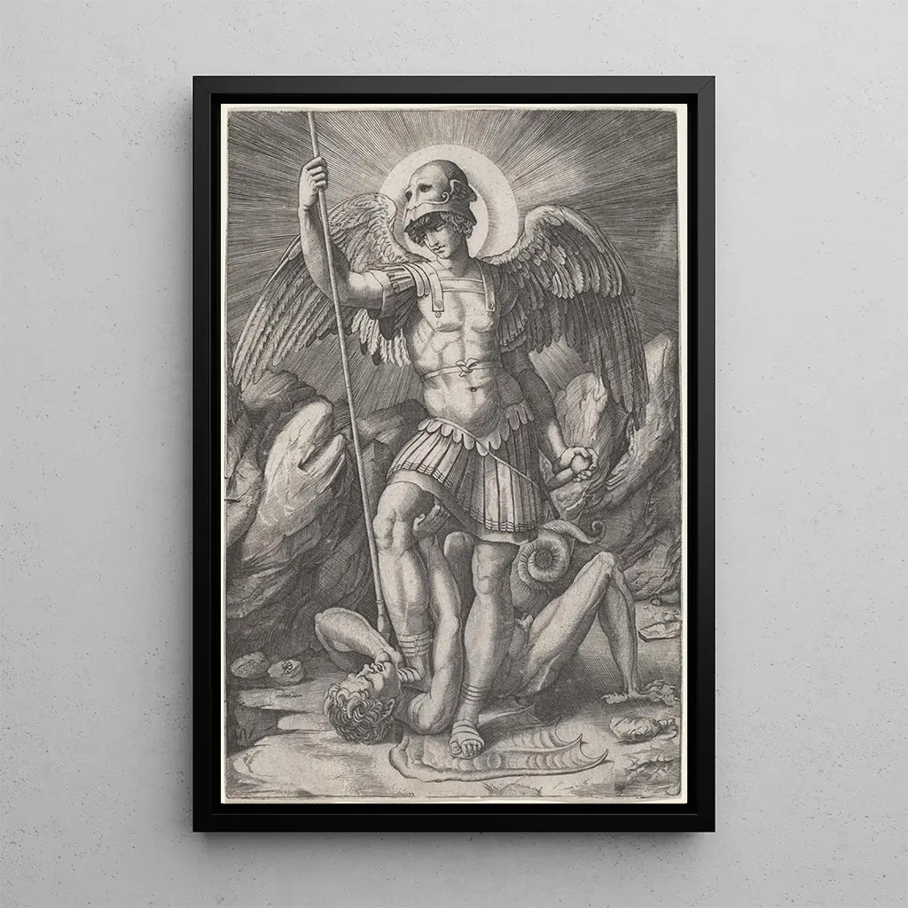 En esta obra impactante, Marco Dente representa a San Miguel, el arcángel guerrero, en una postura dinámica e imponente. La composición está marcada por colores vivos y contrastes intensos, resaltando la fuerza de este personaje celestial. La técnica de grabado utilizada por Dente permite capturar los detalles minuciosos de la armadura y de las alas desplegadas del arcángel. La atmósfera que emana de esta obra es a la vez heroica y espiritual, invitando al espectador a reflexionar sobre la lucha entre el bien y el mal. Esta impresión artística del cuadro es una verdadera oda a la valentía y a la fe.