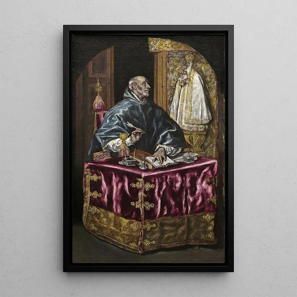 En Saint Ildefonse, El Greco nos ofrece una representación impactante del santo, envuelto en una luz divina que parece emanar de él mismo. Los colores cálidos y dorados de la impresión artística crean una atmósfera de serenidad y reverencia, mientras que los pliegues fluidos y los detalles minuciosos de las vestimentas añaden una dimensión táctil a la obra. La postura del santo, las manos levantadas en señal de oración, evoca una profunda conexión espiritual, invitando al espectador a compartir este momento de éxtasis místico. La composición en su conjunto transmite una fuerza emocional que trasciende el simple retrato para convertirse en una verdadera oda a la fe.