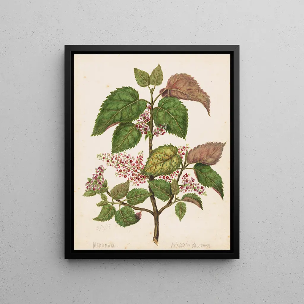 Sarah Featon, una artista neozelandesa del siglo XIX, es reconocida por sus ilustraciones botánicas de una precisión notable. En 'Makomako Aristotelia racemosa', captura la belleza y la complejidad de esta planta endémica de Nueva Zelanda, también conocida como 'Māori Makomako'. Esta obra forma parte de una serie de láminas que destacan la flora única de la región, evidenciando el creciente interés por la botánica en esa época. El estilo de Featon, a la vez detallado y delicado, permite apreciar cada matiz de la planta, rindiendo homenaje a la riqueza natural de su país. Hoy en día, esta obra puede aportar un toque de naturaleza y frescura a cualquier interior, invitando a una contemplación apacible. La impresión artística de esta obra está disponible en Artem Legrand.