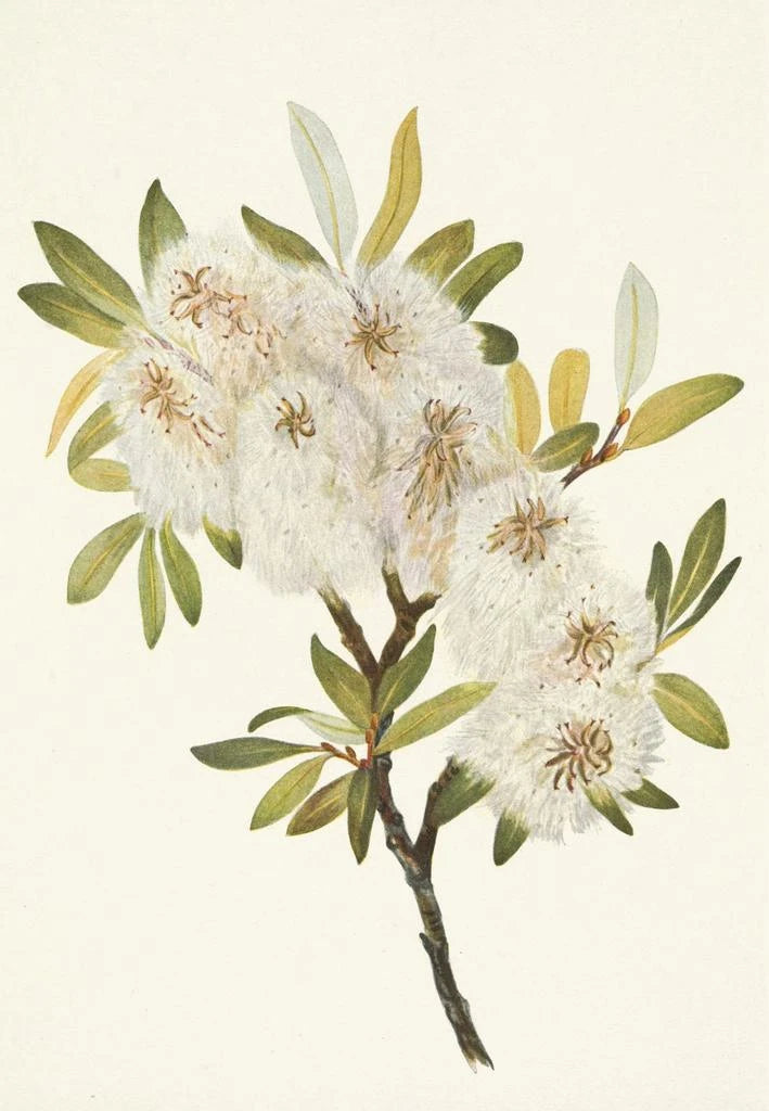 La impresión artística del Saule de Drummond, o Salix drummondiana, evoca un paisaje tranquilo donde la naturaleza se despliega con gracia. Sus ramas flexibles y sus hojas delicadas, a menudo bañadas por la luz, crean una atmósfera de calma y dulzura. Las tonalidades de verde y plata, sutilmente representadas, invitan a la contemplación y a la ensoñación. Mary Vaux Walcott, mediante su técnica de acuarela, logra capturar la esencia misma de este árbol, ofreciendo una visión poética de la flora que nos rodea.