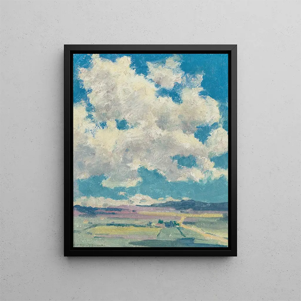 La obra "Sobre el valle de Taos" de Eanger Irving Couse es una verdadera oda a la belleza natural y a la cultura de los pueblos indígenas de América. Pintada a principios del siglo XX, esta obra transporta al espectador a un paisaje encantador, donde las majestuosas montañas se mezclan con un cielo de una profundidad infinita. Couse, a través de su pincel, logra capturar la esencia misma del valle de Taos, un lugar que ha inspirado a numerosos artistas y escritores. La luz, los colores y las formas se combinan para crear una atmósfera a la vez serena y vibrante, invitando a una contemplación introspectiva. La impresión artística de esta obra permite redescubrir esta magia y experimentarla en su propio espacio vital.