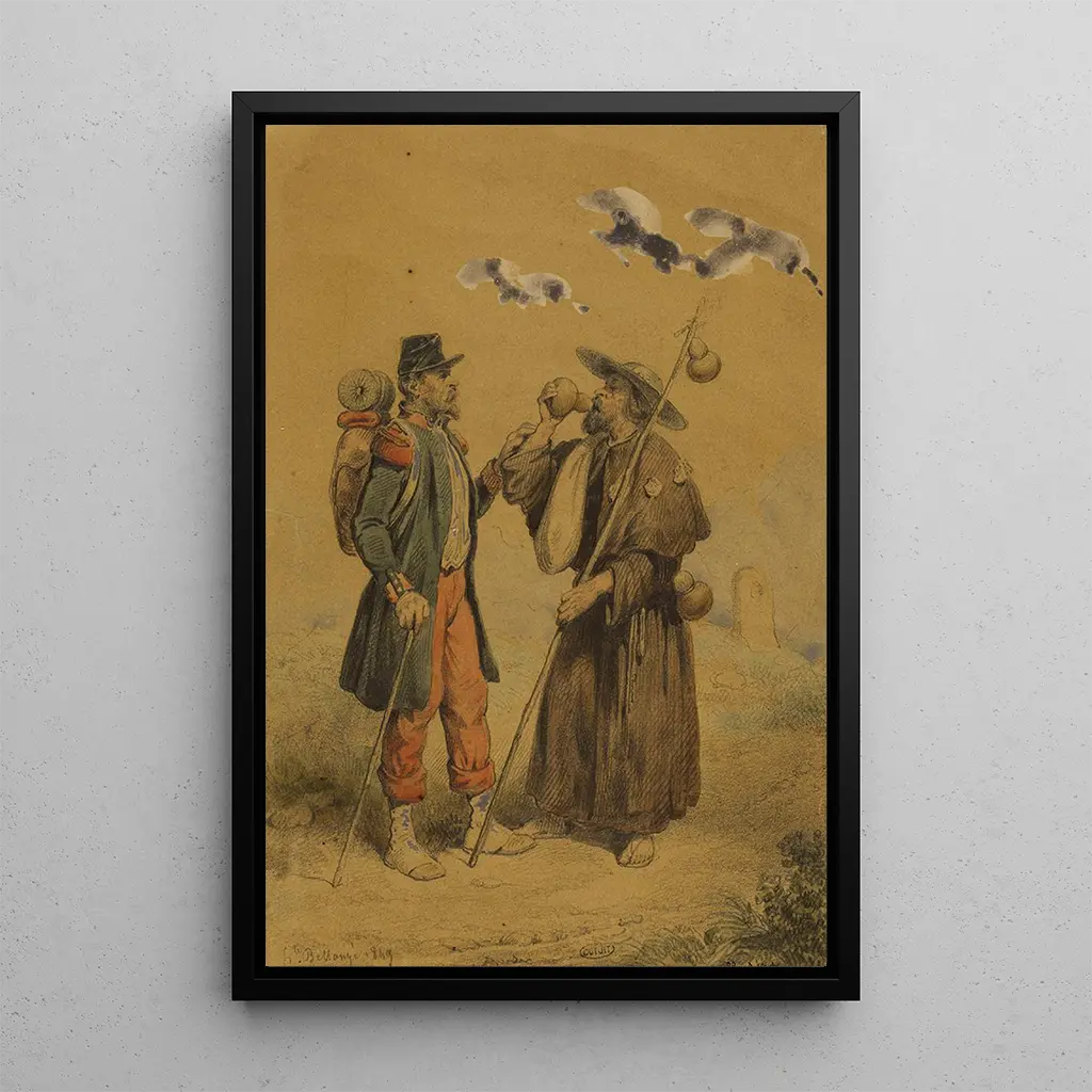 En la obra "Soldado dando de beber a un peregrino" de Hippolyte Bellangé, un momento de ternura y humanidad se despliega ante nuestros ojos. La escena, rica en detalles, destaca a un soldado con uniforme, ofreciendo agua a un peregrino cansado. Los colores cálidos y terrosos evocan una atmósfera de calidez y solidaridad, mientras que la técnica de Bellangé, combinando realismo y romanticismo, da vida a esta interacción emotiva. Cada elemento de la composición, desde las expresiones hasta las posturas, contribuye a crear una narración visual poderosa que toca el corazón.