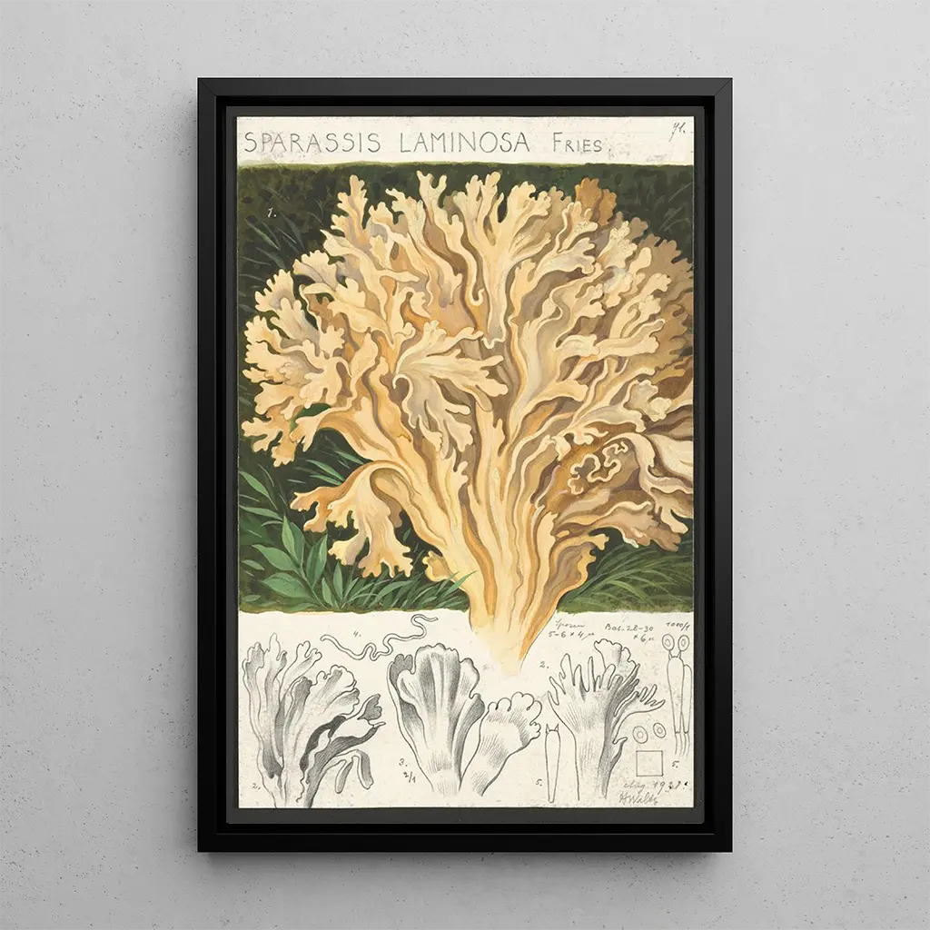 La impresión artística de Sparassis laminosa Fries, obra de Hans Baldung, nos sumerge en un universo donde la naturaleza se expresa con una delicadeza extraordinaria. Los tonos cálidos y terrosos, combinados con matices de verde, evocan un bosque misterioso donde el hongo se erige majestuosamente. La técnica de Baldung, caracterizada por un realismo impactante y una atención minuciosa a los detalles, crea una atmósfera casi mágica. Cada contorno está cuidadosamente trabajado, invitando al espectador a explorar las sutilezas de esta composición orgánica. La luz desempeña un papel fundamental, iluminando las formas y acentuando la textura del hongo, como un rayo de sol atravesando el follaje.