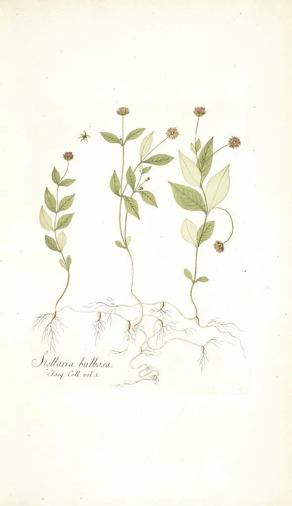 Nikolaus Joseph Freiherr von Jacquin es una figura emblemática del siglo XVIII, que combina ciencia y arte en sus representaciones botánicas. Botánico de renombre, dedicó su vida al estudio de las plantas, influenciado por los descubrimientos de su tiempo. Sus viajes por Europa y las Antillas le permitieron recopilar especímenes raros, que ilustró con una precisión notable. La impresión artística de Stellaria bulbosa testimonia su habilidad para capturar la belleza de la naturaleza mientras respeta los principios científicos. Su legado perdura a través de sus obras, que continúan inspirando a los aficionados a la botánica y al arte.
