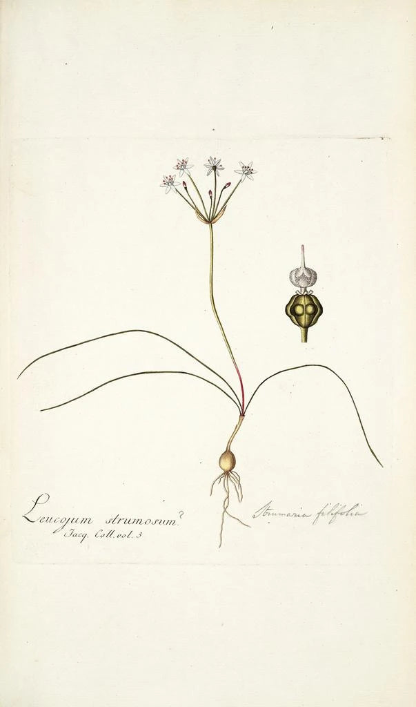 Nikolaus Joseph Freiherr von Jacquin, botánico y artista austriaco del siglo XVIII, es reconocido por sus contribuciones significativas a la ilustración botánica. Influenciado por los viajes de exploración y el descubrimiento de nuevas especies, Jacquin supo combinar ciencia y arte en sus obras. Su período de creación coincide con la edad de oro de la botánica, donde cada planta era minuciosamente estudiada y representada. Sus ilustraciones, como la de Strumaria filifolia, testimonian su compromiso de hacer accesible y comprensible la belleza de la naturaleza, enriqueciendo al mismo tiempo los conocimientos botánicos de su época.