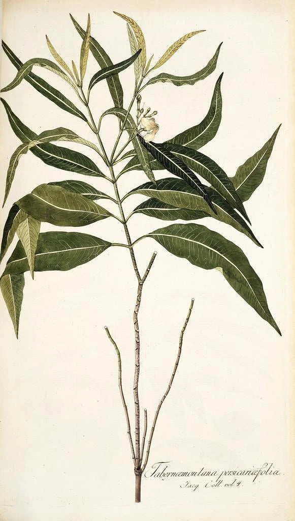 La impresión artística de Tabernaemontana persicariaefolia es una invitación a explorar la riqueza de la flora tropical. Con sus tonos vibrantes y sus formas armoniosas, esta obra evoca la ligereza y la gracia de las plantas. Las tonalidades de verde, blanco y amarillo se combinan con delicadeza, creando un cuadro vivo que atrae la mirada. La técnica del artista, que combina precisión científica y sensibilidad artística, permite sentir la energía vital de esta planta. Cada detalle está cuidadosamente representado, ofreciendo una experiencia visual inmersiva que nos conecta con la belleza de la naturaleza.
