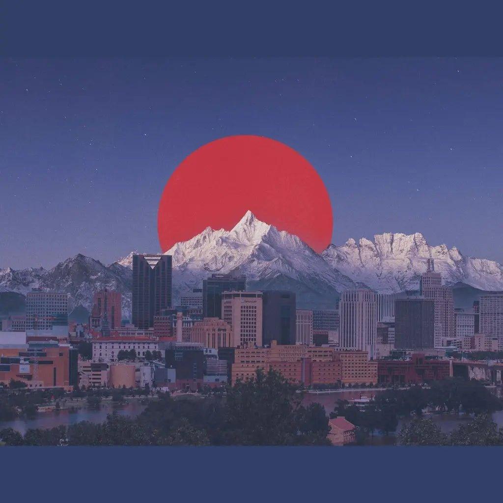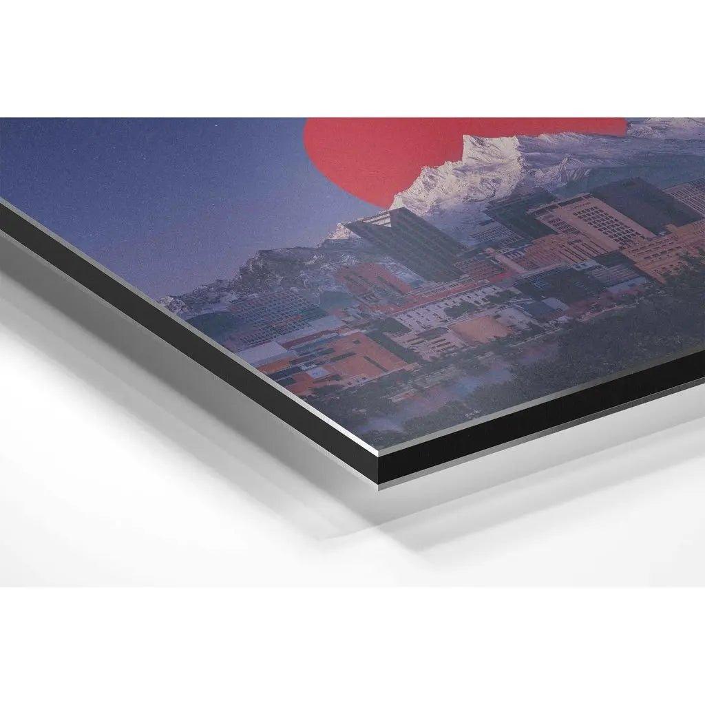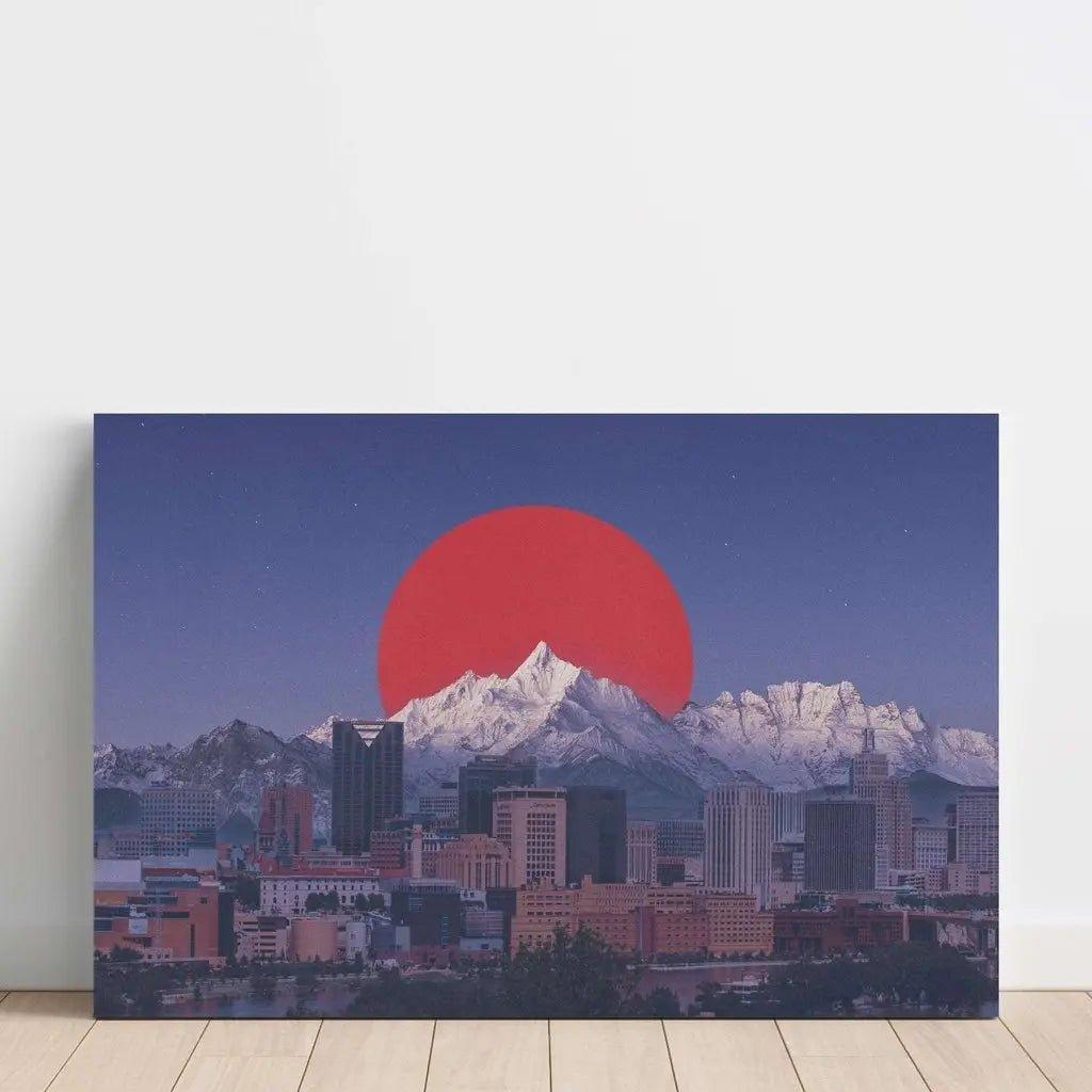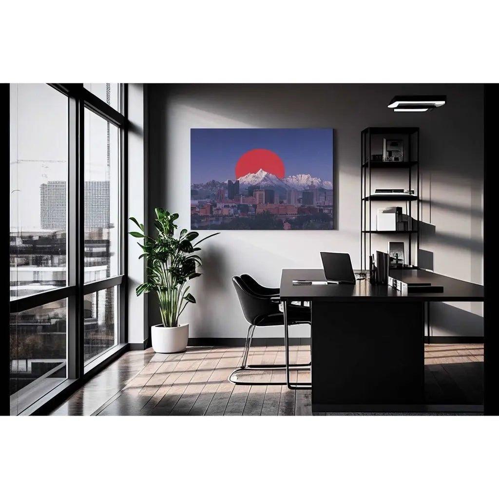 Descubre la armonía perfecta entre la arquitectura urbana y la majestuosidad de la naturaleza con nuestra impresión artística de arte de alta calidad "Armonía Urbana al Crepúsculo Montañés". Esta obra impactante presenta una ciudad moderna, con sus variados rascacielos y edificios coloridos, que se extiende audazmente al pie de una imponente cordillera. Arriba, un gran círculo rojo, evocando el poder solar o un astro imaginario, domina el cielo, creando una escena surrealista y cautivadora.