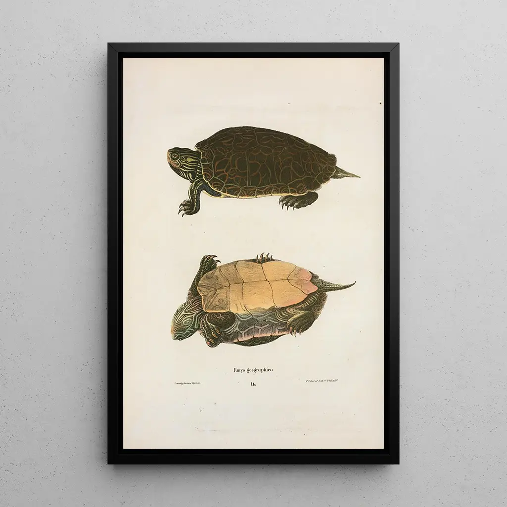La impresión artística de la Tortuga geográfica es una pieza decorativa ideal para enriquecer su interior, ya sea en una sala de estar, una oficina o un dormitorio. Su calidad de impresión garantiza una fidelidad excepcional a los detalles de la obra original, permitiendo apreciar cada matiz y motivo. Con su atractivo estético, este lienzo aporta un toque de naturaleza y elegancia a su decoración. Al elegir esta impresión artística, opta por un elemento que no solo embellece su espacio, sino que también cuenta una historia fascinante sobre la biodiversidad y el arte de la ilustración.