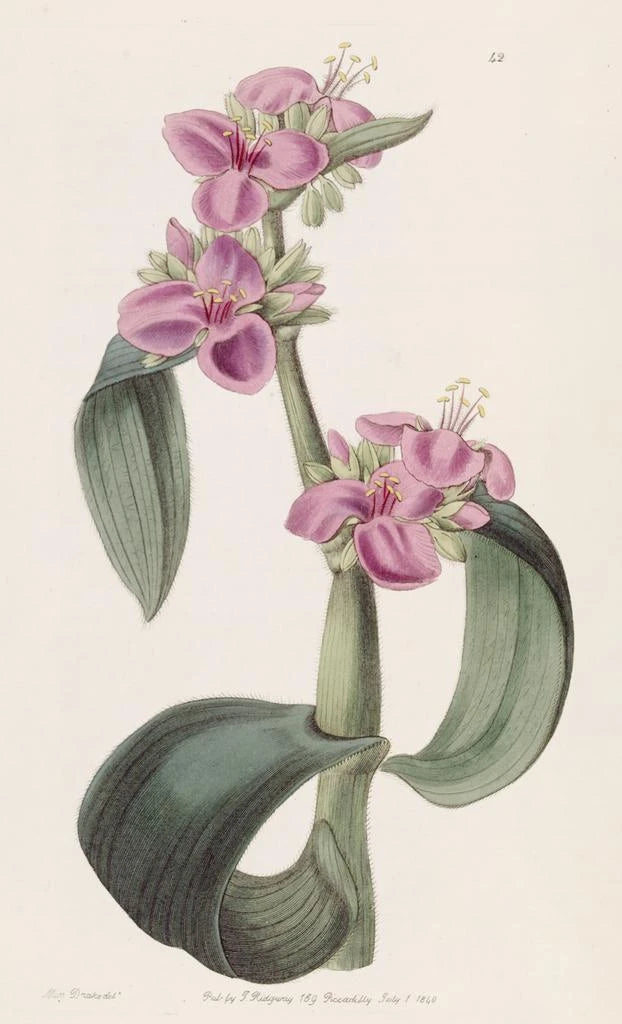 La impresión artística de la Tradescantia à jointures goutteuses nos sumerge en un universo vibrante donde la naturaleza se expresa a través de tonos brillantes y formas delicadas. Las hojas, con patrones variados, parecen bailar bajo la luz, creando un juego de sombras y reflejos. La técnica de acuarela utilizada por Sydenham Edwards aporta ligereza a la obra, mientras que las tonalidades de verde y violeta evocan una atmósfera a la vez relajante y revitalizante. Cada detalle está cuidadosamente representado, testimonio de una observación minuciosa de esta planta fascinante.
