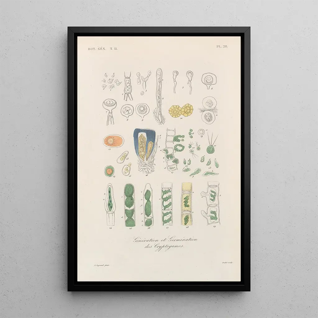 El cuadro "Traité de botanique générale Pl079" de François Hérincq es una verdadera oda a la belleza de la flora. Esta obra, realizada con una precisión minuciosa, revela una composición rica en detalles, donde cada planta se destaca por sus colores vibrantes y matices delicados. La técnica de la acuarela, utilizada con maestría, confiere a toda la obra una atmósfera ligera y aérea, invitando al espectador a sumergirse en el universo botánico. Las formas orgánicas y las texturas variadas crean un diálogo armonioso, transformando esta tela en un verdadero jardín suspendido.