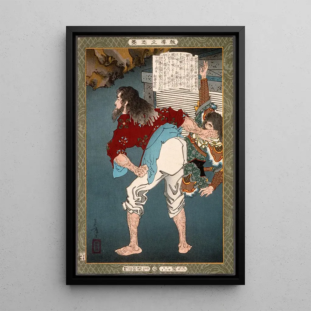Tsukioka Yoshitoshi, nacido en 1839, es uno de los últimos grandes maestros de la impresión artística ukiyo-e, un estilo de impresión japonesa que alcanzó su apogeo en el siglo XVII. Influenciado por los cambios sociales y políticos de su época, Yoshitoshi supo combinar tradición e innovación, creando obras que reflejan tanto la belleza del mundo natural como las luchas humanas. Su carrera, marcada por períodos de gloria y dificultades, dejó un legado artístico imborrable, convirtiéndolo en una figura imprescindible en la historia del arte japonés. Sus obras, como Tsuki no Kishi Ikina, testimonian su genialidad creativa y su capacidad para capturar la esencia de lo efímero.