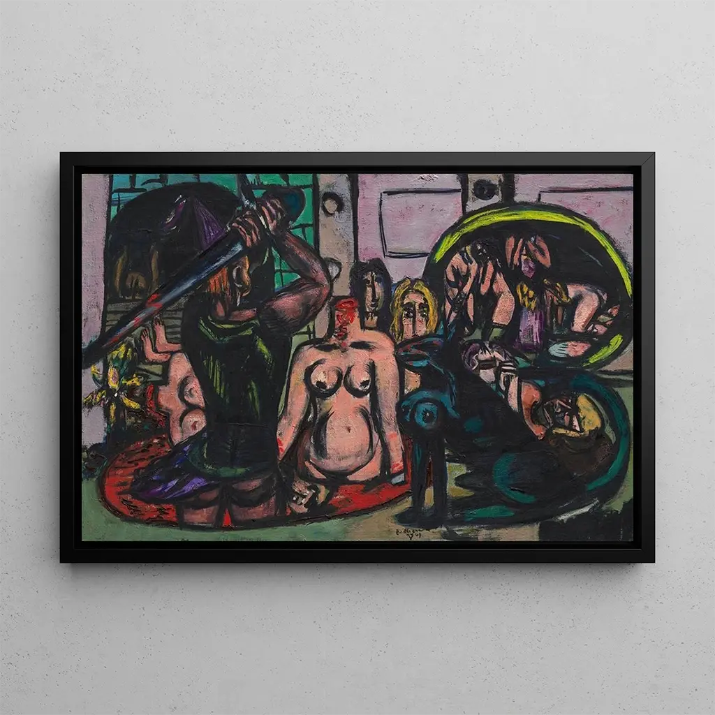 La impresión artística de El último deber de Perseo de Max Beckmann nos transporta a un universo lleno de emoción y simbolismo. Esta obra, con sus colores vibrantes y sus formas expresivas, ilustra el momento trágico en el que Perseo se prepara para cumplir con su destino. La composición compleja, que combina figuras humanas y elementos mitológicos, crea una atmósfera a la vez sombría y cautivadora. Beckmann, con su estilo único, logra transmitir la tensión dramática de la escena, invitando al espectador a sentir el peso del destino que recae sobre el héroe.