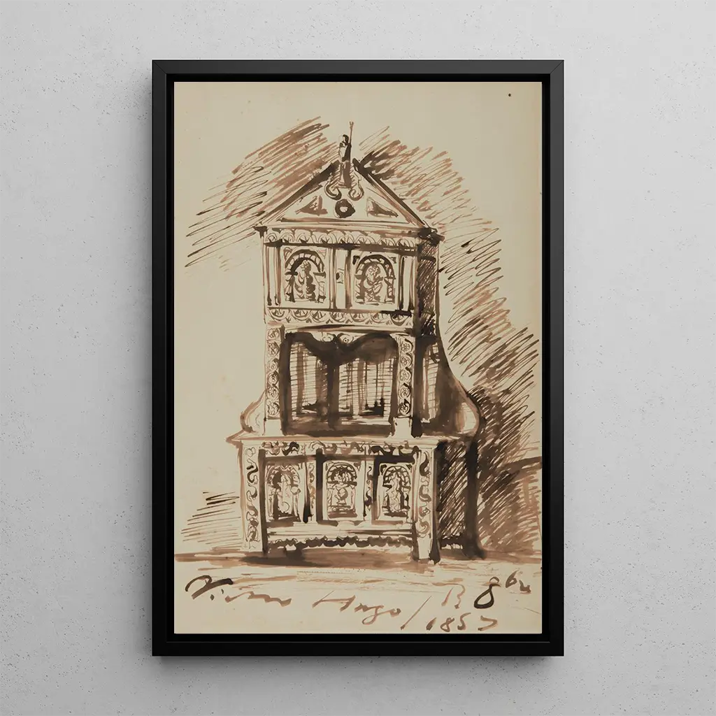 El cuadro "Un buffet" de Victor Hugo nos sumerge en un universo donde la artesanía encuentra la naturaleza. La composición, rica en detalles, destaca un mueble de madera tallada, adornado con motivos florales delicados. Los colores cálidos, que van desde los marrones profundos hasta los verdes suaves, crean una atmósfera acogedora y cálida. La técnica de pintura de Hugo, que combina realismo y romanticismo, da vida a este objeto cotidiano, transformándolo en una obra de arte en toda regla. Cada pincelada parece contar una historia, invitando al espectador a detenerse en la belleza de las cosas simples.