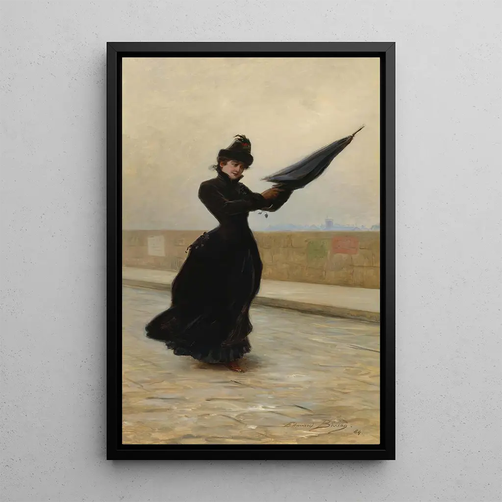 "Un día ventoso" de Édouard Bisson es una obra que captura la ligereza y la vivacidad de un día animado por el viento. Los colores pastel, que combinan matices de azul, verde y amarillo, evocan una atmósfera alegre y dinámica. Los personajes, vestidos con prendas flotantes, parecen moverse con gracia, como si el viento los llevara en una danza ligera. La composición, equilibrada y armoniosa, invita al espectador a sentir la frescura del aire y la belleza de un momento efímero, donde la naturaleza y la humanidad se encuentran en una celebración de la vida.