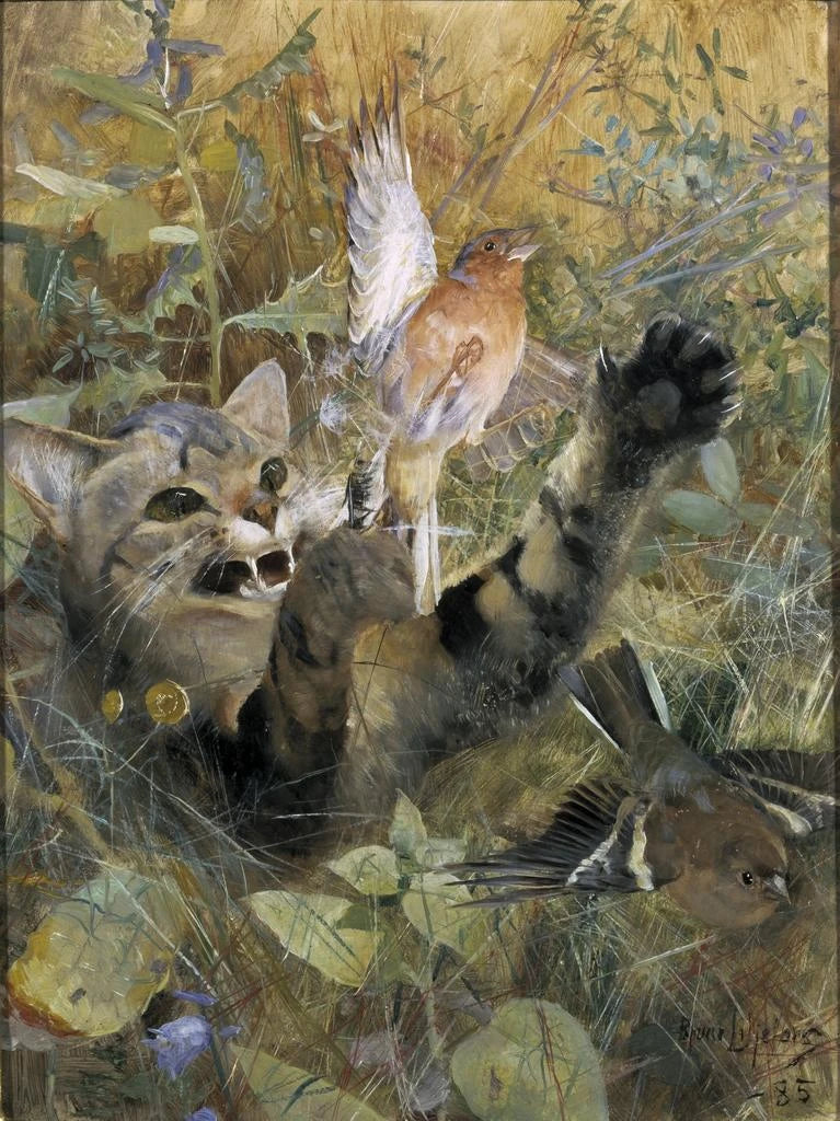 Cuadro Un gato y un jilguero - Bruno Liljefors | Impresión artística