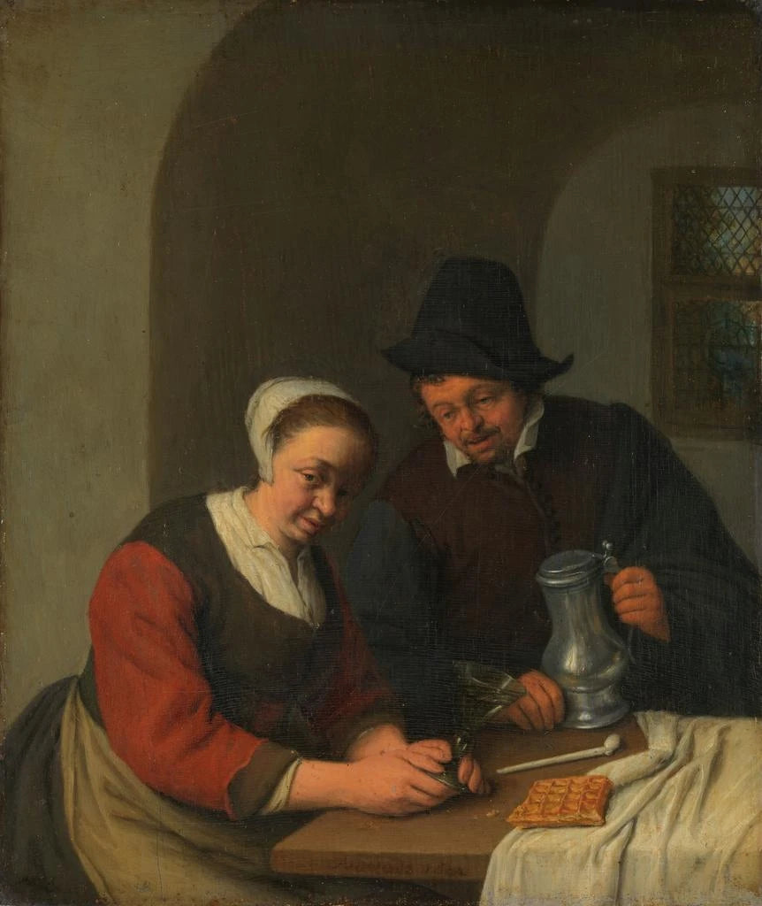 La obra se caracteriza por un estilo barroco que combina hábilmente luz y sombra, creando un juego de contrastes fascinante. Van Ostade sobresale en la representación de texturas, ya sean las telas delicadas de la ropa o la luminosidad de los rostros. La elección de tonos terrosos y matices cálidos confiere a la escena una atmósfera de convivialidad, al mismo tiempo que sugiere una profundidad emocional. La composición está cuidadosamente orquestada, con una atención especial a la disposición de los personajes y a la interacción entre ellos. Las expresiones faciales y los gestos delicados de los protagonistas revelan una intimidad sugestiva, incitando al espectador a cuestionarse sobre la naturaleza de su intercambio. Este cuadro encarna la esencia misma de la pintura de género, donde lo cotidiano se convierte en un espejo del alma humana.