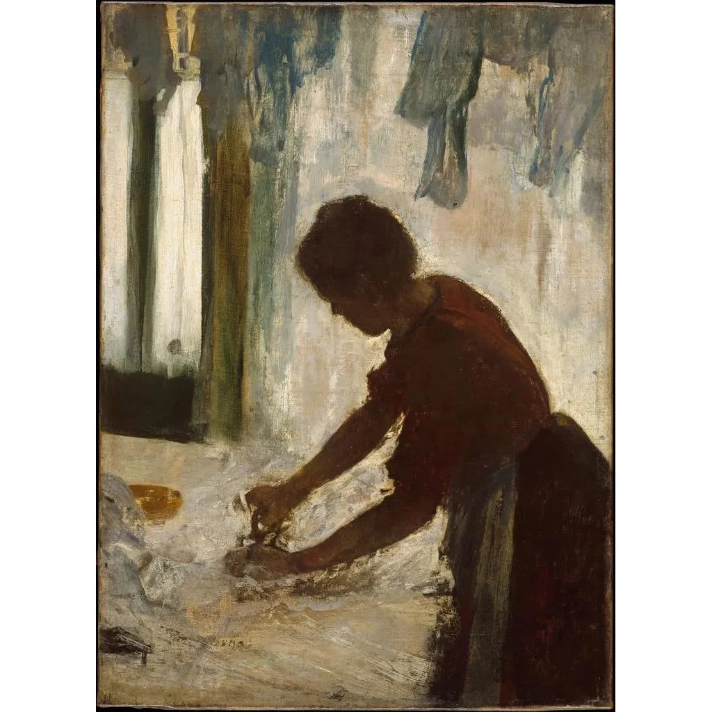En "Una mujer planchando", Edgar Degas captura un momento íntimo de la vida doméstica con una sensibilidad sorprendente. La composición del lienzo destaca la figura femenina, concentrada en su tarea, mientras que colores suaves y juegos de luz crean una atmósfera cálida. La técnica de Degas, que combina pastel y óleo, da vida a la textura de las prendas y a la luz que atraviesa la habitación. Este cuadro evoca una sencillez elegante, revelando la belleza de los gestos cotidianos y la intimidad de la vida familiar.