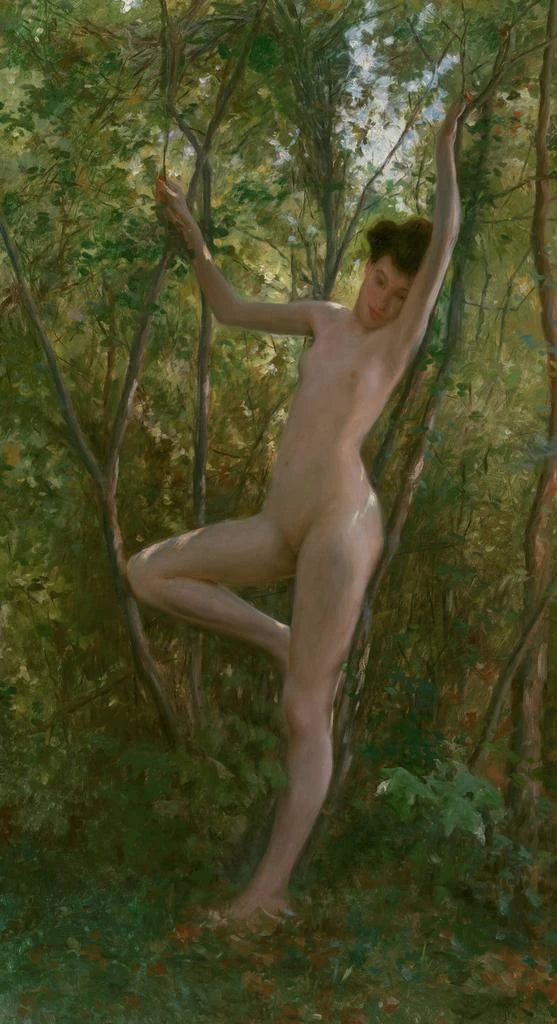 Dans "Une nymphe des bois", Julius LeBlanc Stewart nos sumerge en un universo encantador donde la belleza de la naturaleza se combina con la gracia femenina. La composición está dominada por tonos verdes y marrones, evocando el bosque exuberante. La luz suave filtra a través del follaje, creando una atmósfera tranquila y casi mística. La ninfa, vestida con un vestido ligero, parece bailar con las sombras y las luces, encarnando el espíritu de la naturaleza. La técnica de Stewart, que combina realismo y impresionismo, da vida a cada detalle, desde las hojas delicadas hasta los reflejos en la piel de la figura central, invitando al espectador a una contemplación prolongada.
