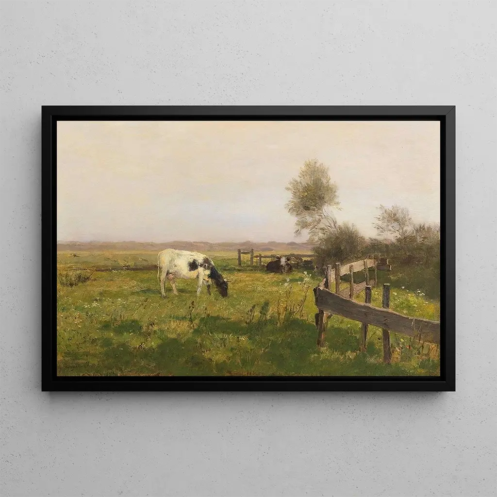Vache au pâturage : una escena bucólica llena de serenidad La impresión artística Vache au pâturage de Eugen Jettel nos transporta a un paisaje pastoral donde reina la tranquilidad. Esta obra, realizada con colores suaves y naturales, evoca la belleza sencilla de la vida rural. Las tonalidades de verde de los prados, combinadas con toques de marrón y blanco de la vaca, crean una atmósfera relajante. La técnica de pintura al óleo, dominada por Jettel, permite capturar la luz de una manera que da vida a la escena. Cada pincelada parece respirar la calma de una tarde soleada, invitando al espectador a sumergirse en esta naturaleza preservada. Eugen Jettel : un maestro del paisaje pastoral Eugen Jettel, pintor austriaco del siglo XIX, es reconocido por sus representaciones de la naturaleza y escenas rurales. Influenciado por el movimiento impresionista, supo integrar elementos de luz y color que hacen vibrantes sus obras. Jettel pasó gran parte de su carrera explorando los paisajes del campo, buscando capturar la esencia de la vida al aire libre. Su trabajo suele asociarse con un período en el que el arte se orientaba hacia la naturaleza, en reacción a la creciente industrialización. La impresión artística Vache au pâturage testimonia su talento para inmortalizar momentos de sencillez y belleza. Una adquisición decorativa con múltiples ventajas La impresión artística del cuadro Vache au pâturage es una pieza decorativa ideal para aportar un toque de naturaleza a su interior. Ya sea en una sala de estar, una oficina o un dormitorio, este lienzo se integra armoniosamente en diversos estilos de decoración, desde rústico hasta contemporáneo. Su calidad de impresión garantiza una fidelidad notable a los colores y detalles de la obra original, ofreciendo además un atractivo estético indudable. Al elegir esta impresión artística, opta por una obra que evoca paz y serenidad, enriqueciendo su espacio vital con una nota artística y cálida.