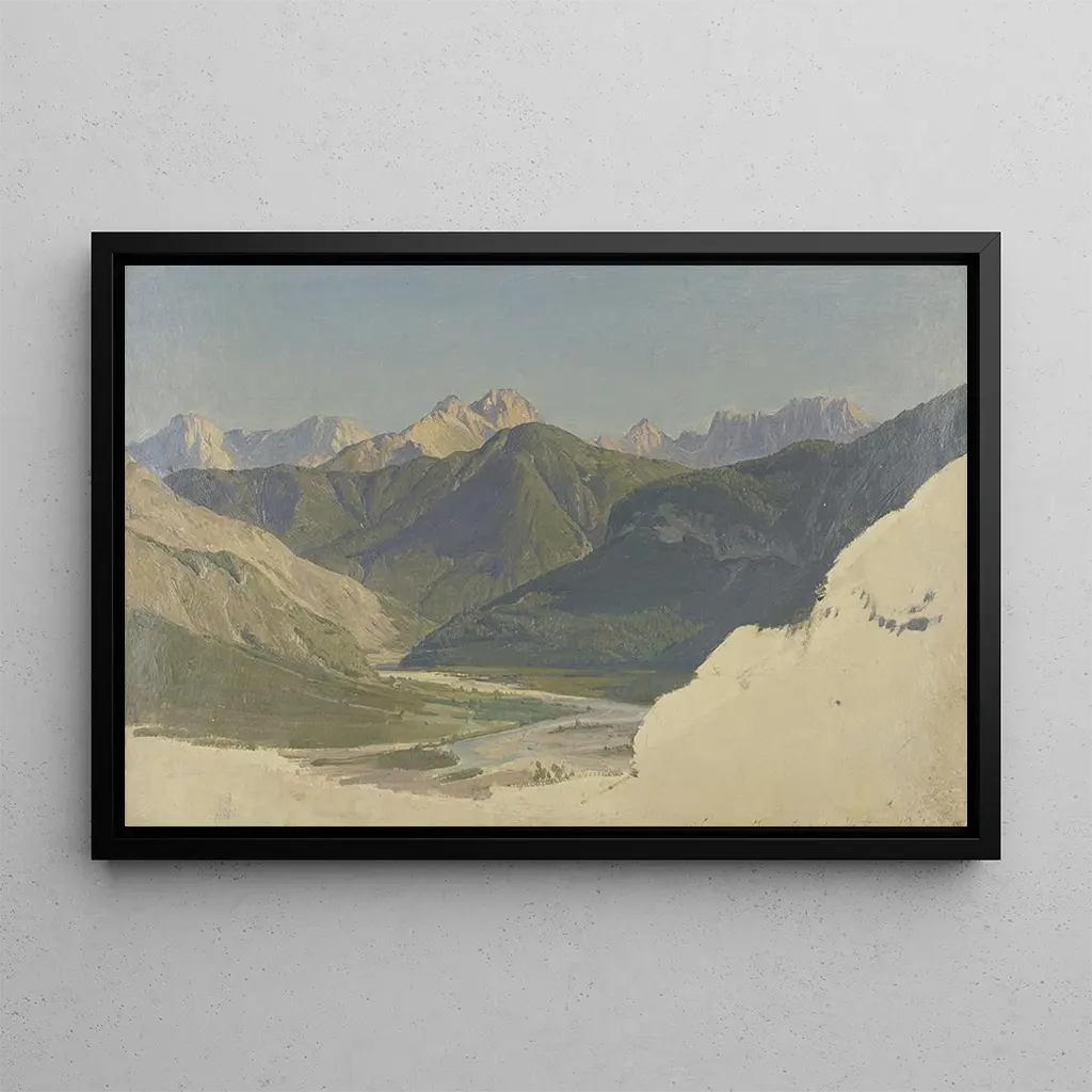 La impresión artística de "Vallée de l'Isar près de Mittenwald" de Eduard Wilhelm Pose nos sumerge en un paisaje alpino de una belleza impresionante. Las majestuosas montañas, cubiertas de vegetación, se reflejan en las aguas cristalinas del río Isar. Los tonos suaves de verde y azul crean una atmósfera de paz y tranquilidad, invitando a la contemplación. La técnica de Pose, caracterizada por detalles minuciosos y una luz sutil, da vida a esta escena idílica, donde la naturaleza parece florecer en toda su esplendor.