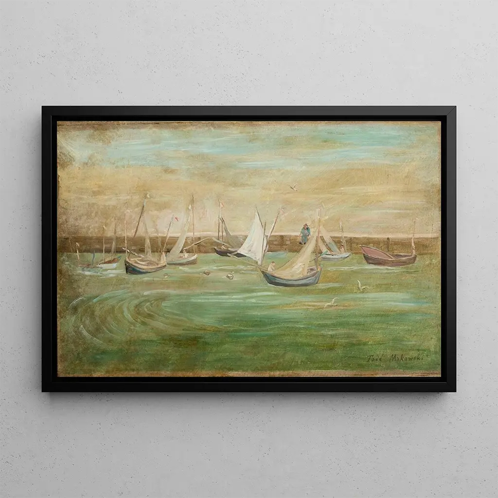 En esta obra de Tadeusz Makowski, las impresión artística de veleros cobra vida, deslizándose con gracia sobre las aguas tranquilas. Los colores vibrantes y las formas estilizadas evocan una atmósfera alegre y dinámica, donde el movimiento de las velas parece casi palpable. Makowski, con su enfoque único, logra capturar la esencia misma de la navegación, combinando abstracción y realidad. Cada elemento de la composición, desde las velas hasta los reflejos en el agua, está cuidadosamente orquestado para crear una armonía visual que transporta al espectador a un mundo marítimo encantador.
