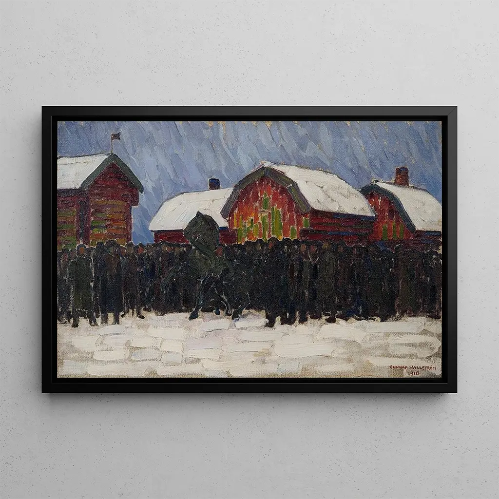 Venta de caballos : una dinámica de mercado animada. La impresión artística del cuadro "Venta de caballos" de Gunnar Hallström evoca una escena vibrante y animada, donde la energía de los caballos y los compradores se mezclan en un entorno rural. Los colores vivos y los detalles minuciosos de los animales capturan la esencia misma de la transacción, haciendo palpable la emoción del momento. Hallström, con su dominio de los juegos de luz y sombra, logra crear una atmósfera viva, donde cada personaje parece cobrar vida. La obra invita a contemplar no solo la belleza de los caballos, sino también la importancia de la cría y el comercio en la sociedad de su época. Gunnar Hallström : un artista en el corazón de la tradición ecuestre. Gunnar Hallström, pintor sueco de principios del siglo XX, es reconocido por sus obras que celebran la relación entre el hombre y el caballo. Influenciado por el movimiento impresionista, Hallström supo traducir la dinámica de las escenas ecuestres con una sensibilidad única. Su carrera, aunque relativamente corta, dejó una huella significativa en el mundo del arte, especialmente por sus representaciones realistas y poéticas de los caballos. Al inscribirse en la tradición de los pintores animalistas, Hallström contribuyó a poner en valor la importancia de estos animales en la cultura y la economía de su tiempo. Una adquisición decorativa con múltiples ventajas. Esta impresión artística del cuadro "Venta de caballos" es una elección perfecta para embellecer su interior, ya sea en una sala de estar, una oficina o una sala de ocio. Su calidad de impresión garantiza una fidelidad notable a los detalles de la obra original, añadiendo además un toque de dinamismo a su decoración. El atractivo estético de esta tela reside en su capacidad para captar la atención y evocar emociones, transformando así cualquier espacio en un lugar de intercambio y convivialidad. Al integrar esta obra en su decoración, aporta una pieza de historia y cultura que sabrá cautivar a sus invitados.