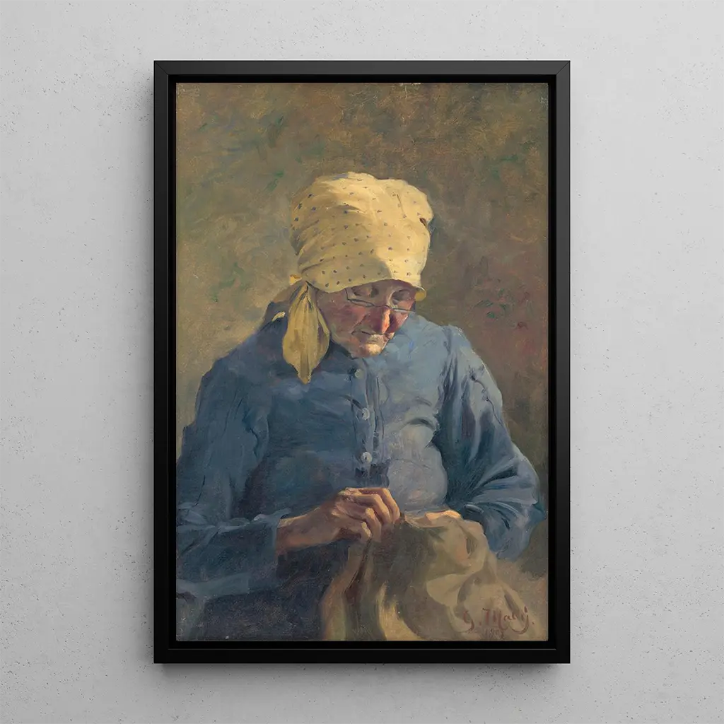 En esta impresión artística de "Vieja mujer cosiendo", el artista captura la esencia de la vida cotidiana a través de los rasgos marcados de su sujeto. Los colores terrosos, mezclados con toques de luz suave, crean una atmósfera cálida e íntima. La técnica de Mahler, que combina realismo y sensibilidad, permite sentir la profundidad de las emociones de esta mujer, cuyo mirada parece contar historias de trabajo y dedicación. Cada pliegue de su ropa y cada arruga de su rostro testimonian una vida llena de experiencias, invitando al espectador a una contemplación silenciosa.
