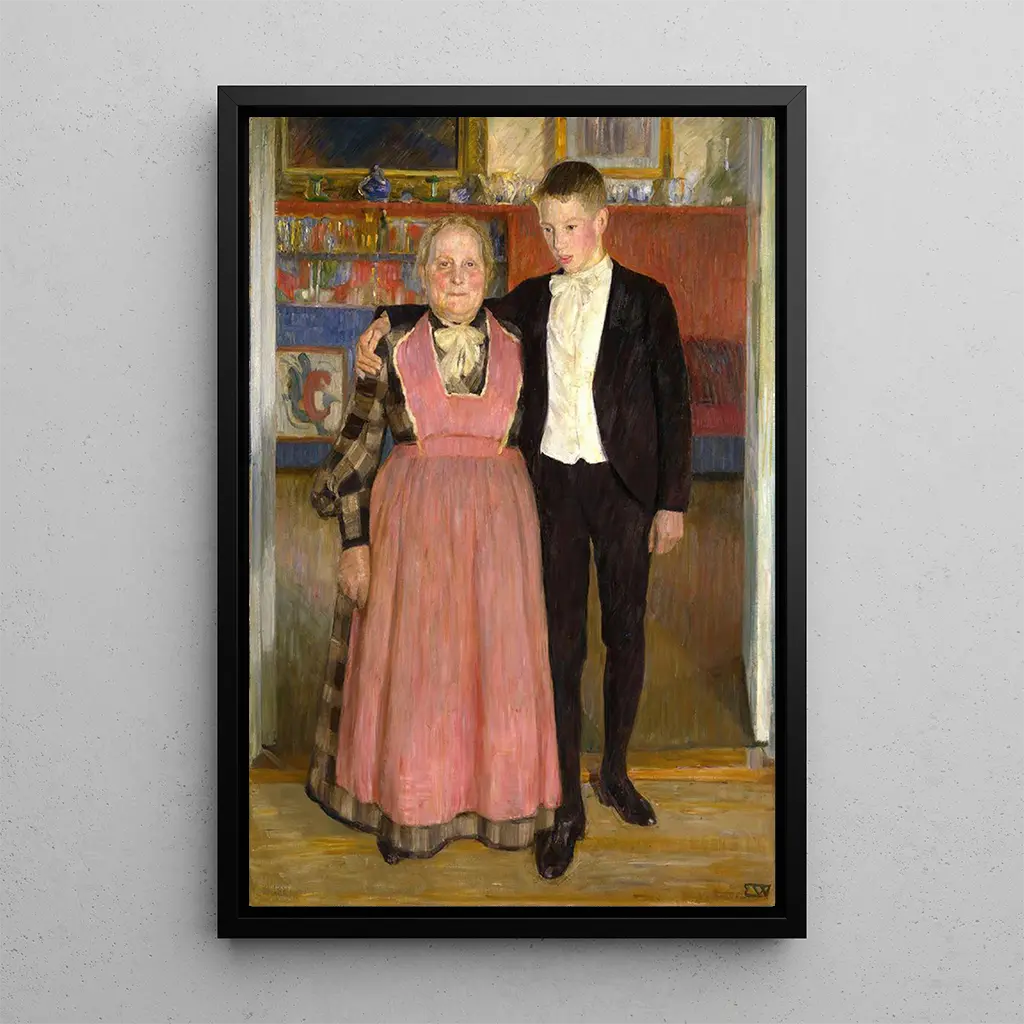 La impresión artística de Vieja nodriza de Erik Werenskiold nos sumerge en un universo lleno de dulzura y nostalgia. Este lienzo, realizado con matices cálidos y terrosos, evoca la sencillez de la vida rural. El artista utiliza técnicas de pintura al óleo para capturar las texturas de las prendas y la piel arrugada de la nodriza, testimonio de una vida de dedicación. La atmósfera que emana de la obra es a la vez pacífica y reconfortante, invitando al espectador a reflexionar sobre los lazos afectivos que unen a las generaciones.