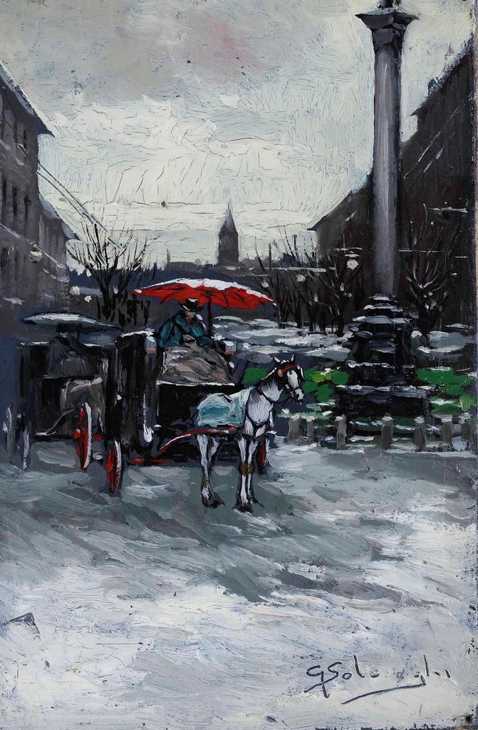 En esta impresión artística de "Vue urbaine avec carrosse", Giuseppe Solenghi nos sumerge en el corazón de una ciudad vibrante, donde el movimiento y la actividad se combinan armoniosamente. Los colores cálidos y terrosos, junto con toques de luz, crean una atmósfera viva y dinámica. El carruaje, símbolo de elegancia y estatus social, atrae la mirada en el centro de la composición, mientras que los transeúntes y los edificios en el fondo añaden una profundidad narrativa a la obra. La técnica de Solenghi, que combina realismo y toques impresionistas, nos invita a sentir la efervescencia de la vida urbana del siglo XIX.