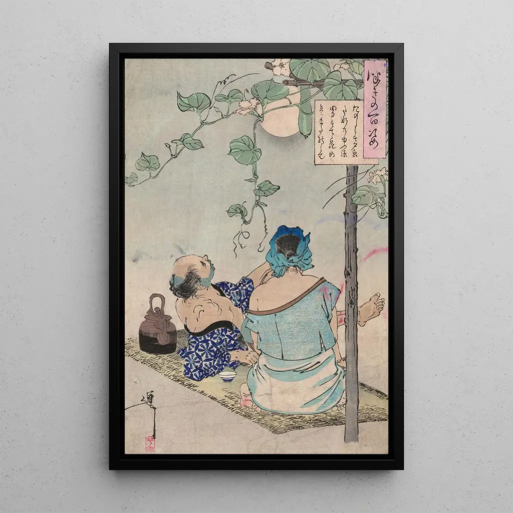 En la impresión artística Ygao dana nry zu, Tsukioka Yoshitoshi nos sumerge en un universo donde la belleza y la melancolía se encuentran. La composición es rica en detalles, cada personaje siendo cuidadosamente colocado para crear una dinámica cautivadora. Los colores, a la vez vivos y delicados, evocan una atmósfera de ensueño, mientras que la técnica de la estampa japonesa, con sus líneas fluidas y sus matices sutiles, confiere a la obra una profundidad inigualable. Este cuadro invita a la contemplación, revelando poco a poco sus secretos a quienes se toman el tiempo de observarlo.