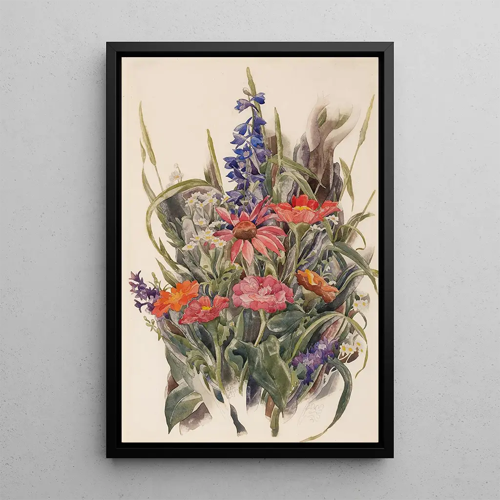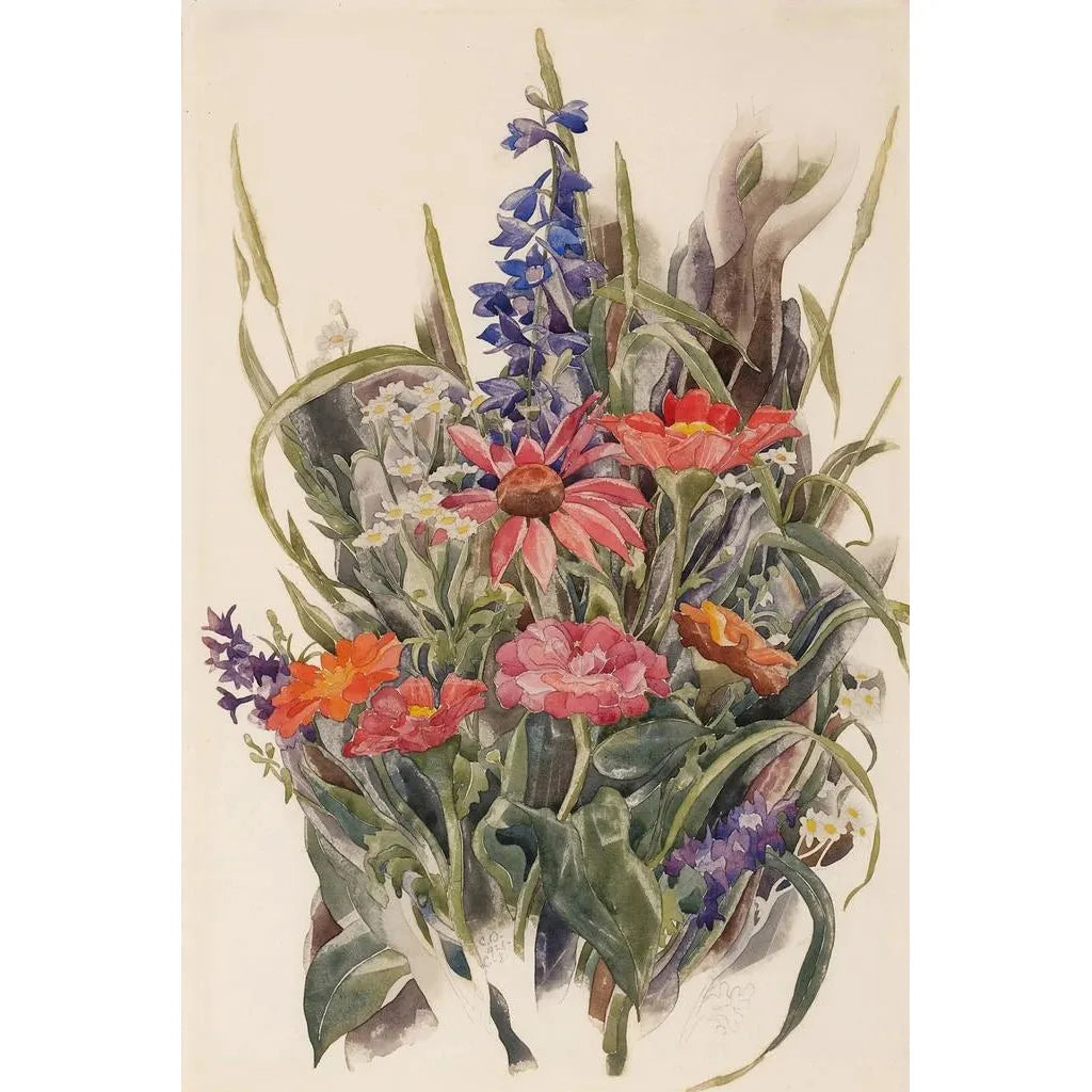 En esta obra vibrante, Charles Demuth captura la belleza efímera de las flores a través de una paleta brillante. Las zinnias, delphiniums y margaritas se entrelazan con una delicadeza sorprendente, creando una composición armoniosa que invita a la contemplación. La técnica de la acuarela, utilizada con maestría, permite que la luz juegue sobre los pétalos, revelando matices sutiles que evocan la frescura de un jardín en plena floración. La atmósfera general del lienzo es a la vez alegre y tranquilizadora, transportando al espectador a un mundo donde la naturaleza florece en toda su esplendor.